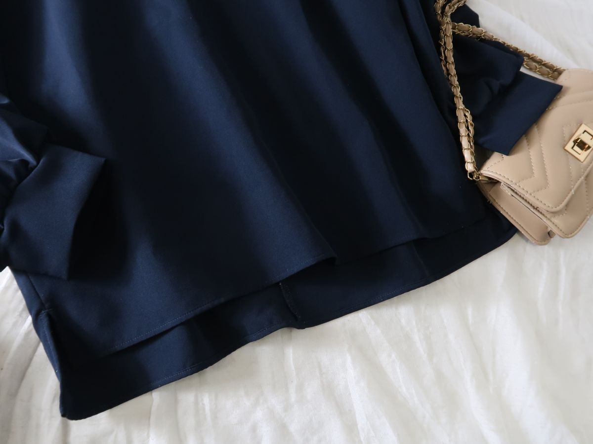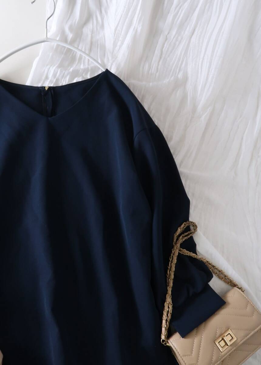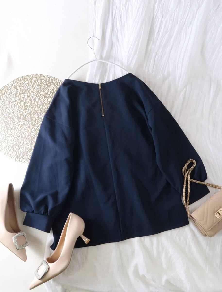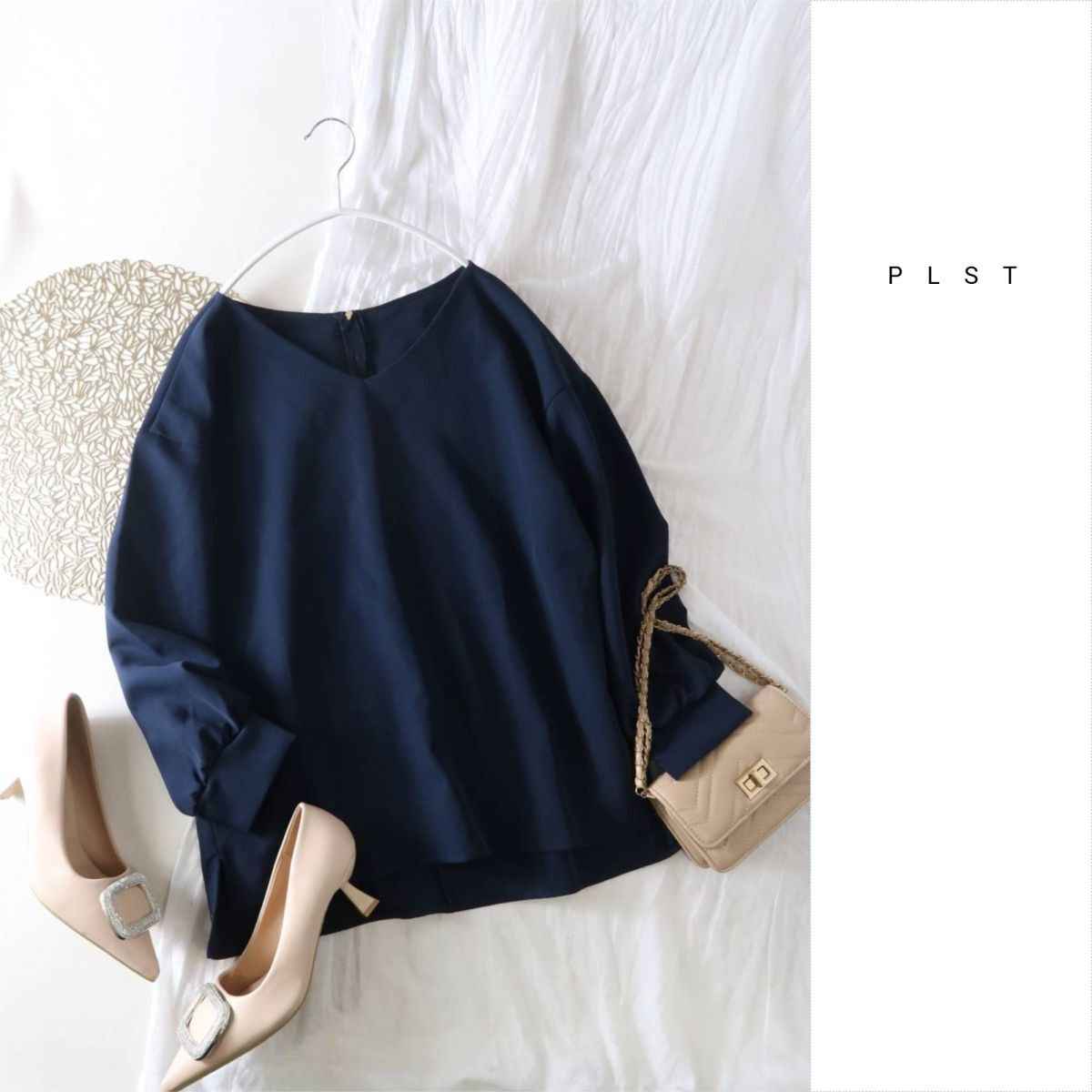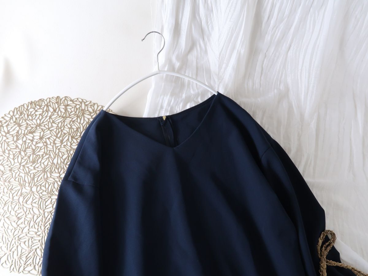 肩をドロップさせたリラックスシルエットで、横に開くVネックやふんわりスリーブが女性らしさを後押しします。