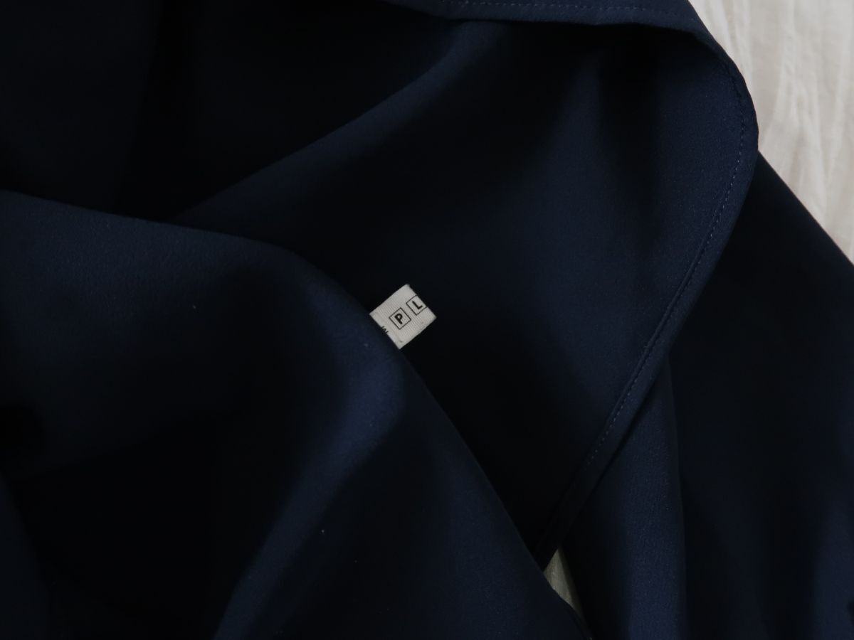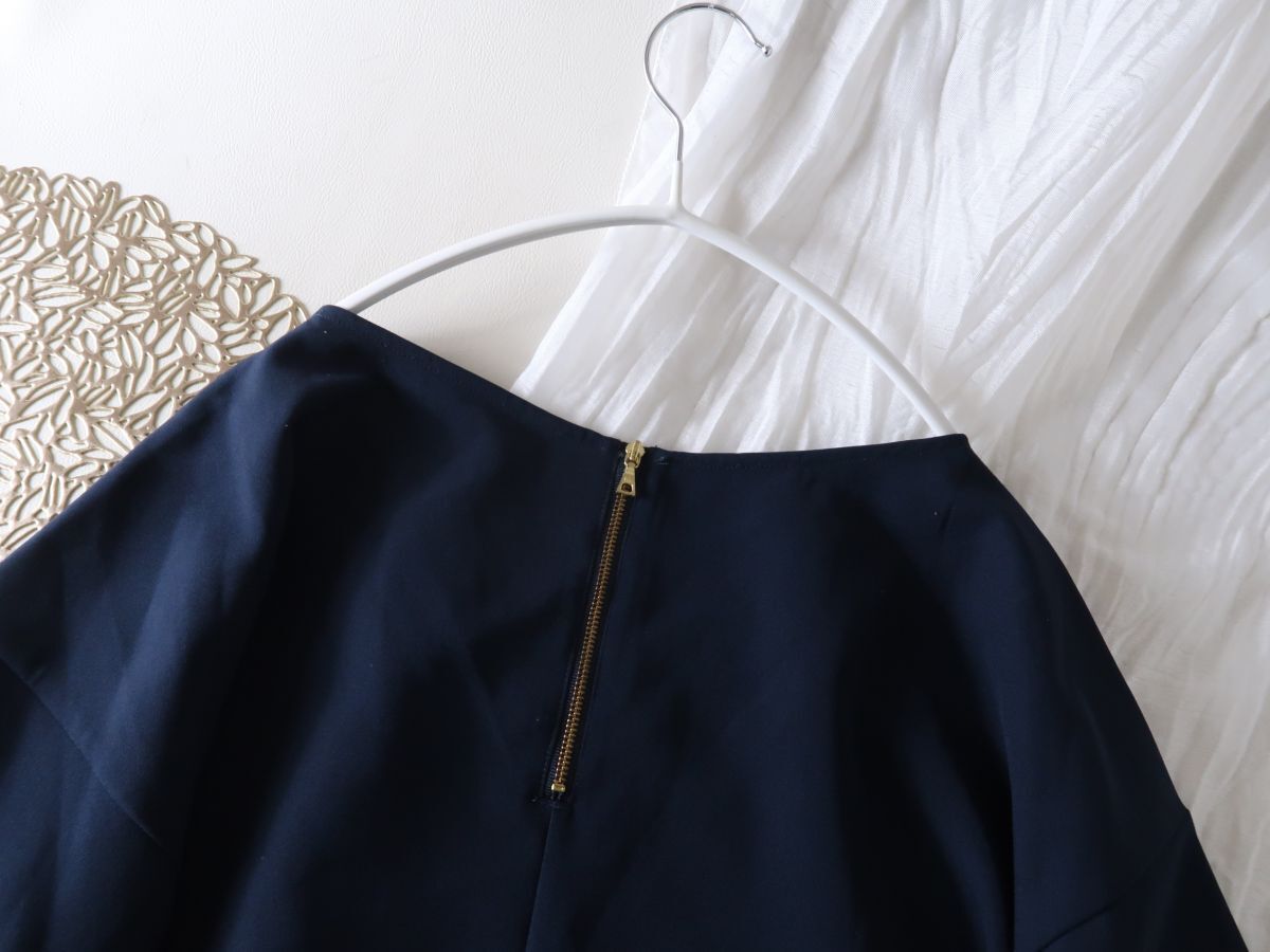 共布で切り替えた袖口は、すっきりとプッシュアップすることも可能です。裾に大胆な前後差を出し、サイドスリットで動きをプラス。バックネックにはメタルジッパーをあしらってアクセントになっています。