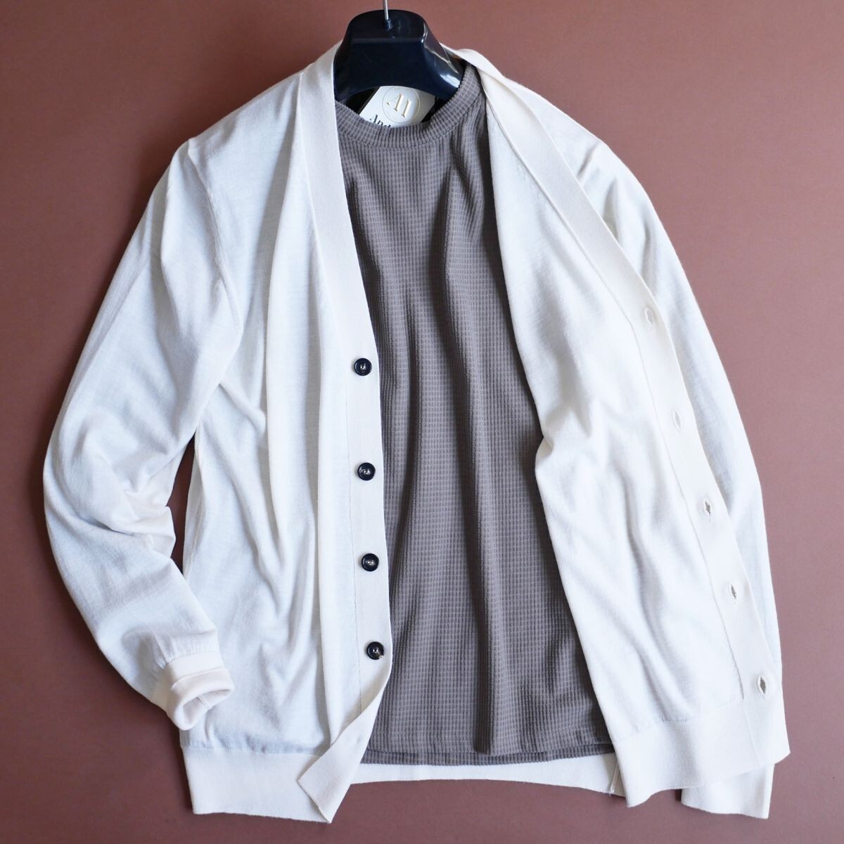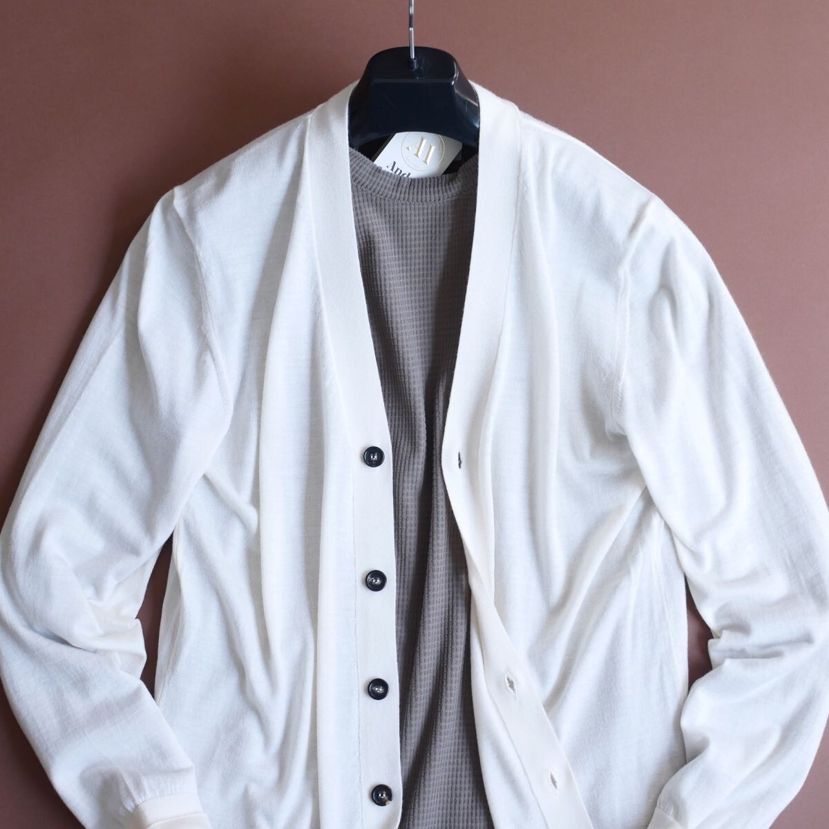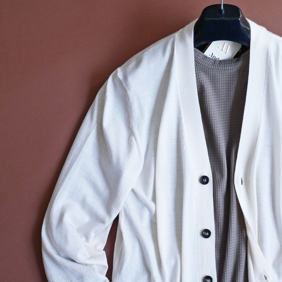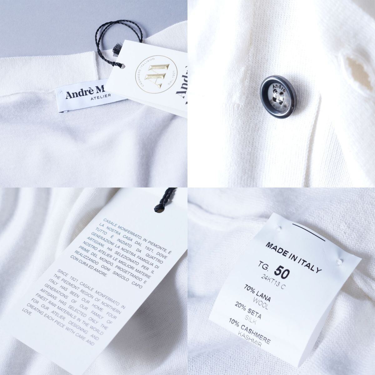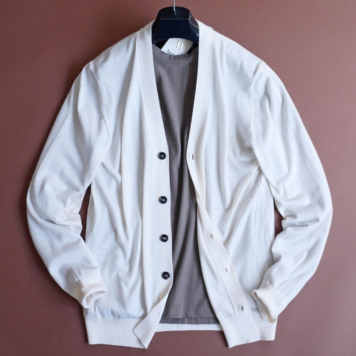 ●1921年、北部イタリアで創業しました、イタリア製熟練メーカー「アンドレ M.」の、エレガントで洗練されたデザインのニットカーディガンとなります。 ●1921年、北部イタリアで創業しました「アンドレ M.」は、一流職人に許される、バチカンのホールを飾るカーテンなどの製作などを経て、カシミヤを中心に、上質シルク、コットン、リネンなどの天然素材を使用したたニットウェアを製作する、熟練職人を有するメーカーです。生地やマテリアルは、ロロピアーナやエルメネジルドゼニア他、イタリア最高級の素材を惜しげも無く使用します。VOGUEイタリア他ファション誌でも多く取り上げられ、有名ブランドの生産も担っている「アンドレ M.」のアイテムは、何といいましても上質な上、正統的でかっこいいスタイル揃いですのでオススメです。 ●Andr M.(アンドレ M.)春夏ニットカーディガン イタリアの熟練ブランド「Andr M.」が手掛ける、上質な素材とエレガントなデザインが融合したニットカーディガン。軽やかで滑らかな肌触りと、洗練されたシルエットが魅力の一着です。 ■ デザイン & シルエット シンプルでありながらも品格漂うVネックデザインに、コントラストを効かせたダークトーンのボタンがアクセント。すっきりとしたシルエットがスマートな印象を与え、シャツやTシャツと合わせても上品にまとまります。裾と袖口はリブ仕様になっており、適度なフィット感を演出。洗練されたイタリアンスタイルを楽しめるデザインです。 ■ 素材 & 機能性 シルクカシミヤを贅沢にハイゲージウールにブレンドすることで、軽さと柔らかさを兼ね備えた極上の着心地を実現。シルクがもたらす上品な光沢と、カシミヤのしっとりとした風合いが融合し、肌に馴染む滑らかなタッチが特徴です。春夏シーズンに最適な通気性と保温性を兼ね備え、快適にご着用いただけます。 ■ スタイリング Tシャツやカットソーの上にさらりと羽織るだけで、シンプルながらも洗練された印象に。デニムやスラックスとの相性も抜群で、カジュアルからビジネスカジュアルまで幅広いスタイルにマッチします。ジャケット代わりとしても活用できる汎用性の高さが魅力。 Andr M.の伝統的なクラフツマンシップが光る、ラグジュアリーなカーディガン。軽やかでエレガントなスタイルを求める大人のワードローブにふさわしい一着です。 ●とてもソフトでなめらかタッチのハイゲージニット。伸縮性あり ●色:パンナビアンコ系 ●素材:ウール70% シルク20% カシミヤ10% ●サイズ:50 *日本サイズ概ねLサイズ辺りとなりますが、着用時の伸縮により比較的多くの方に適応頂けそうです。下記詳細サイズもご確認の上、よろしくお願いいたします。 ●詳細サイズ(cm)置いた状態で: 肩幅:42~50位*着用時伸縮します(右肩端~左肩端の直線距離) 身幅:50~*着用時伸縮します(右脇下~左脇下の直線距離) 袖丈:64(肩の縫い目~袖先) 着丈:72(襟の付け根~裾まで) 詳細サイズご参考 ※大よその採寸となります。 ※お品物はタイトルにございますもののみとなり、着合わせのお洋服や小物などがございましても、それらは含まれません。 ※素材の特性上、多少のことはご容赦くださいませ。 ※ご質問は、必ずご入札前にお願いいたします。(ご入札後、ご落札後の取引ナビからのご質問はお避け下さい) ☆☆☆ご連絡・お支払い(Yahooかんたん決済)☆☆☆ ご落札後24時間以内に、取引ナビからご連絡(お名前・ご住所全て。*サイズ選択いただけるオークションはサイズのご連絡も含め)・Yahooかんたん決済可能な方。 *銀行振込の場合は翌営業日、コンビニ決済はご落札後2日目の午前中まで、お支払いをお済ませ下さいませ。 電話応対は、一切致しておりません。取引ナビをご利用下さい。 ☆☆☆受け取り連絡☆☆☆ 製品到着後24時間以内。*出来る限り、到着日当日に受け取り連絡頂きましたら幸いです。 *配達日指定ご希望の際は、ご落札後、最長4日以内に「受取連絡」ができるようお願いします。(北海道・沖縄・離島の方は5日以内) *特別に記載をしました際には、そちらを優先させていただきます。 ☆☆☆同日に2点以上のご落札の場合☆☆☆ 「まとめて取引」を、最初にご選択ください。 *「まとめて取引」を、お届け情報などご入力前にご選択ください。同梱発送となり、一品分の送料のみとなります。 *「まとめて取引」をご選択されなかった場合、出品者側では送料訂正できませんので、予めご了承くださいませ。 新規IDの方は、こちらを必ずご覧くださいませ ☆☆☆ご入札及びご落札のキャンセルはしていただけません☆☆☆ ![]() 【お支払い】 合計金額 = ご落札価格 + 送料 ◆Yahooかんたん決済(ご落札後24時間以内に支払い手続きを完了ください。) *2点以上同日ご落札の場合は、『まとめて取引』をお選びください。 *領収書がご必要の際:ご落札後Eメールアドレスを、取引メッセージにてお知らせ下さい。電子領収書をEメールに添付してお送り致します。 Yahoo!か