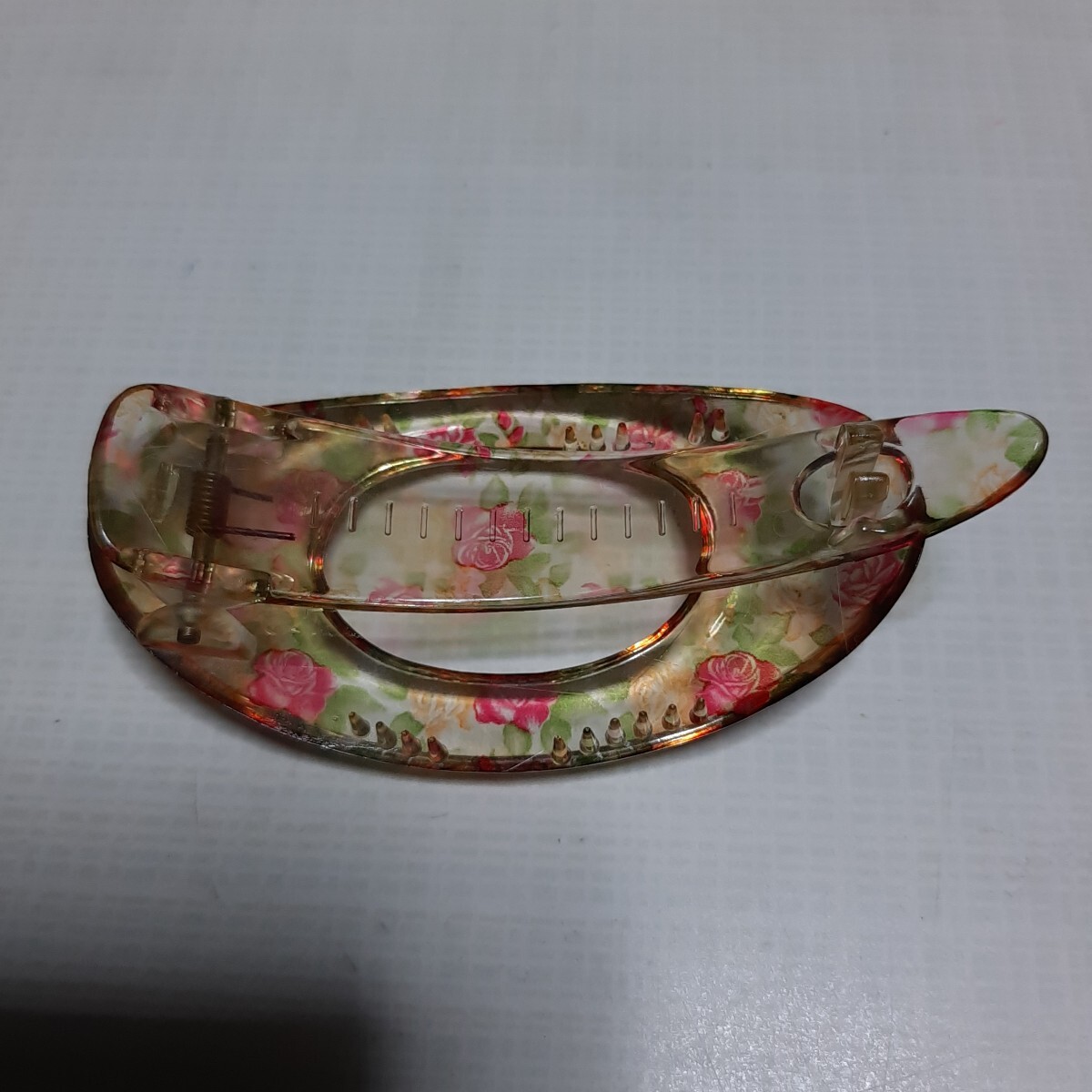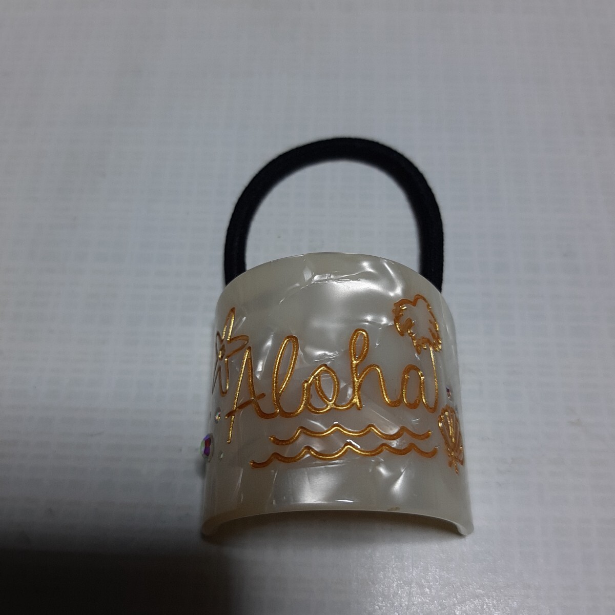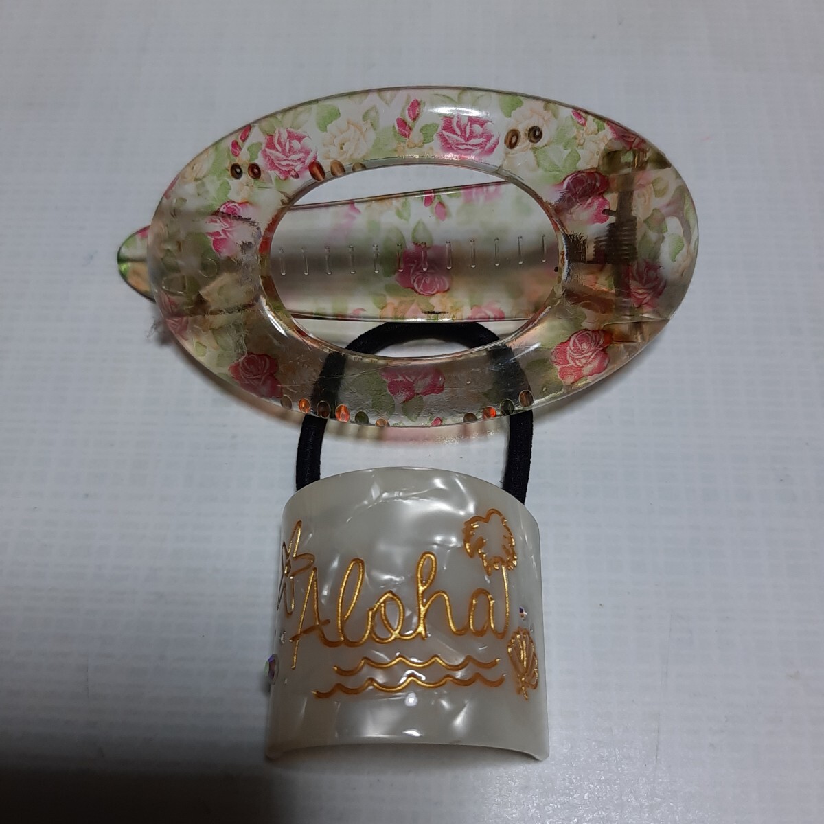 花柄の透明なヘアクリックと オフホワイトのまープル柄にAlohaの文字が金色で描かれている髪止め