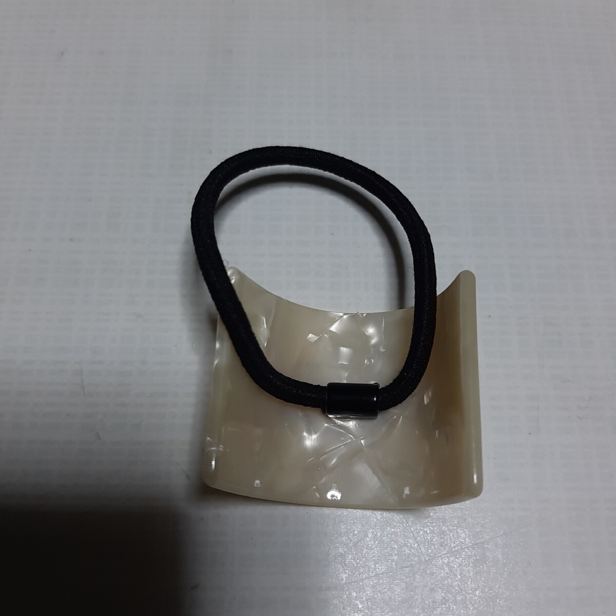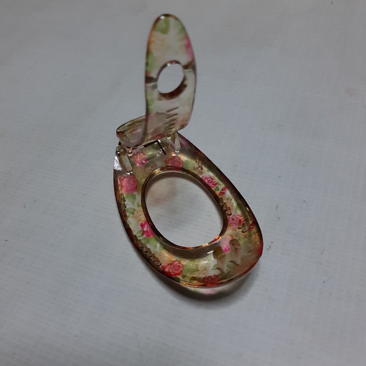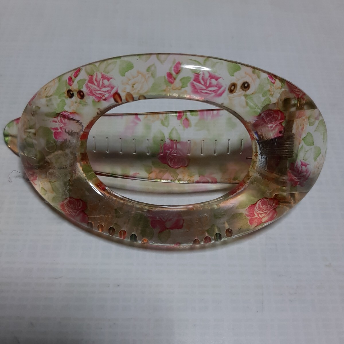 花柄の透明なヘアクリックと オフホワイトのまープル柄にAlohaの文字が金色で描かれている髪止め
