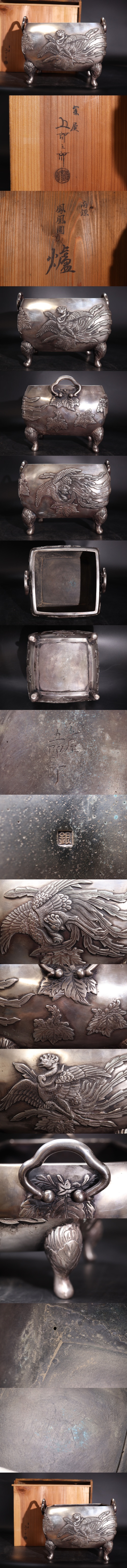 | 銀 印刻 釜屋 金谷五郎三郎 「 南鐐 鳳凰図 爐 」 重量約7.80kg 共箱付 / 火鉢 鉢 灰器 煎茶道具 煎茶飾 .G2391 |