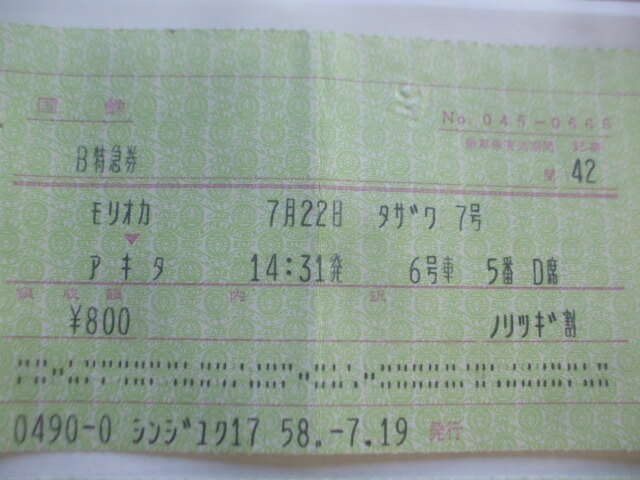 ・58年7月19日  たざわ7号  B特急券  盛岡→秋田