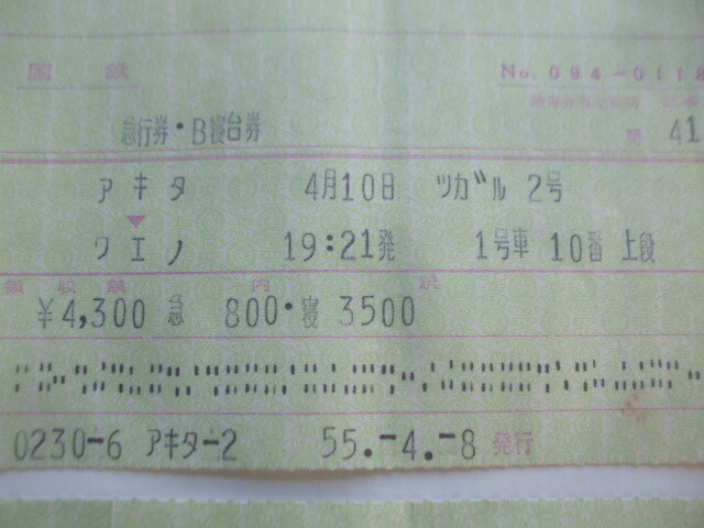 ・55年4月8日   津軽2号 B寝台券 秋田から上野