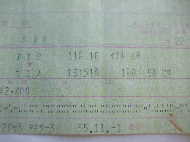 ・55年11月1日  いなほ6号 特急券  秋田→上野