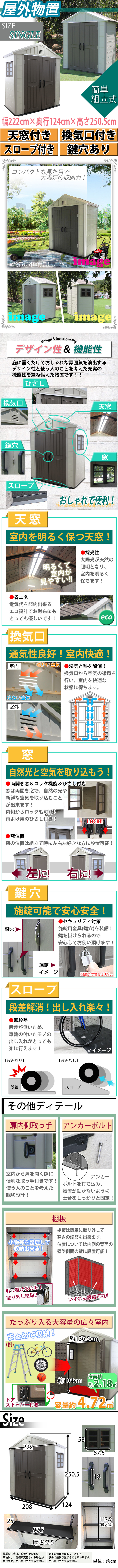 | 商品名 | 送料無料 大型物置 屋外物置 組立て式 シングル 高密度ポリエチレン 天窓付き 窓付き 鍵穴付き ひさし付き 倉庫 小屋 納屋 物置き ガレージ 大型 収納 おしゃれ 庭 DIY 簡易 monookiky01snew |