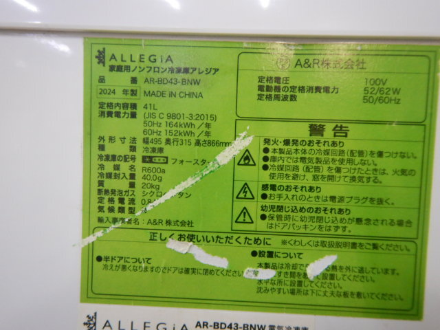 2 2024年製 アレジア 業務用 冷凍 ストッカー AR-BD43-BNW アイス 小型 W495D315H866mm 41L チェスト フリーザー 冷凍庫 20kg