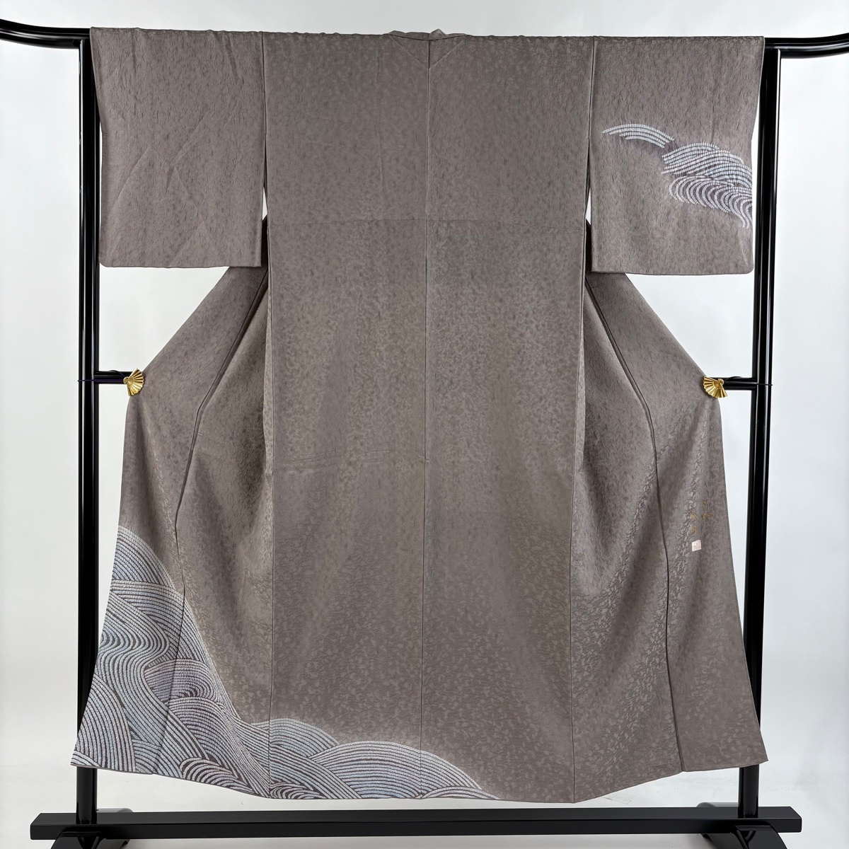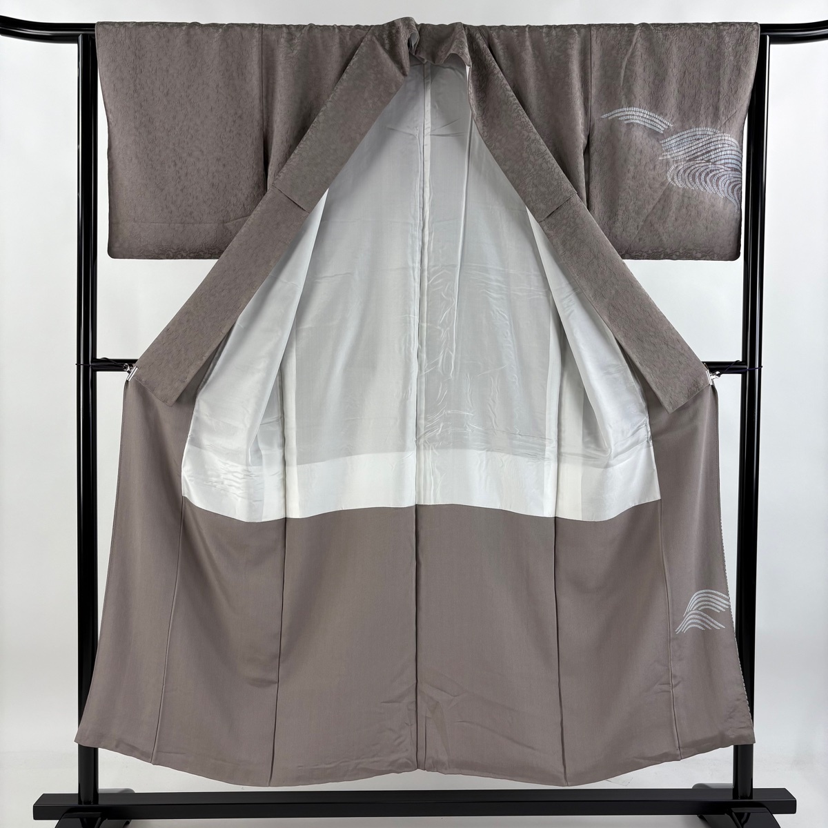 | 付下げ 美品 秀品 落款 波 地紋 絞り 灰茶 袷 身丈151 裄丈63 S 正絹 【中古】 |