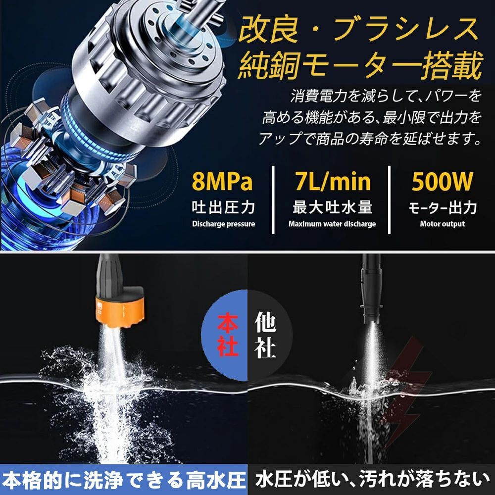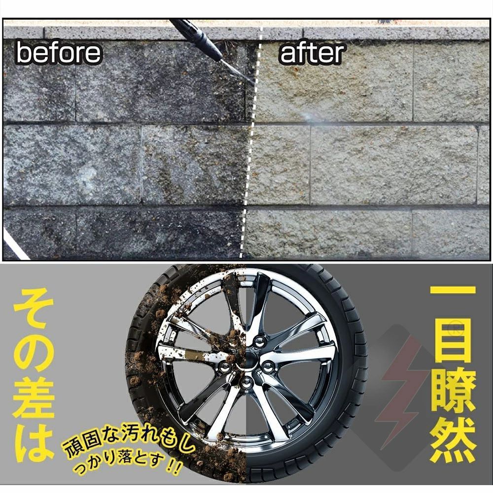 6-in-1多機能延長ノズル付き、0°/15°/25°/40°/シャワー/ストレートの六つ水噴射モードがある、使用シーンに合わせて選択できてとても便利です。3段階水?調節できる8MPaほどの吐出圧力、大掃除や洗車に便利な高圧洗浄機です(水圧がある程度高いと、汚れも落ちやすくなるので、8MPa以上のモデルお勧めします)コケなど頑固な汚れ、ベランダや網戸、ドアサッシ、室外掃除、お風呂や室内掃除などカンタンに掃除できます。