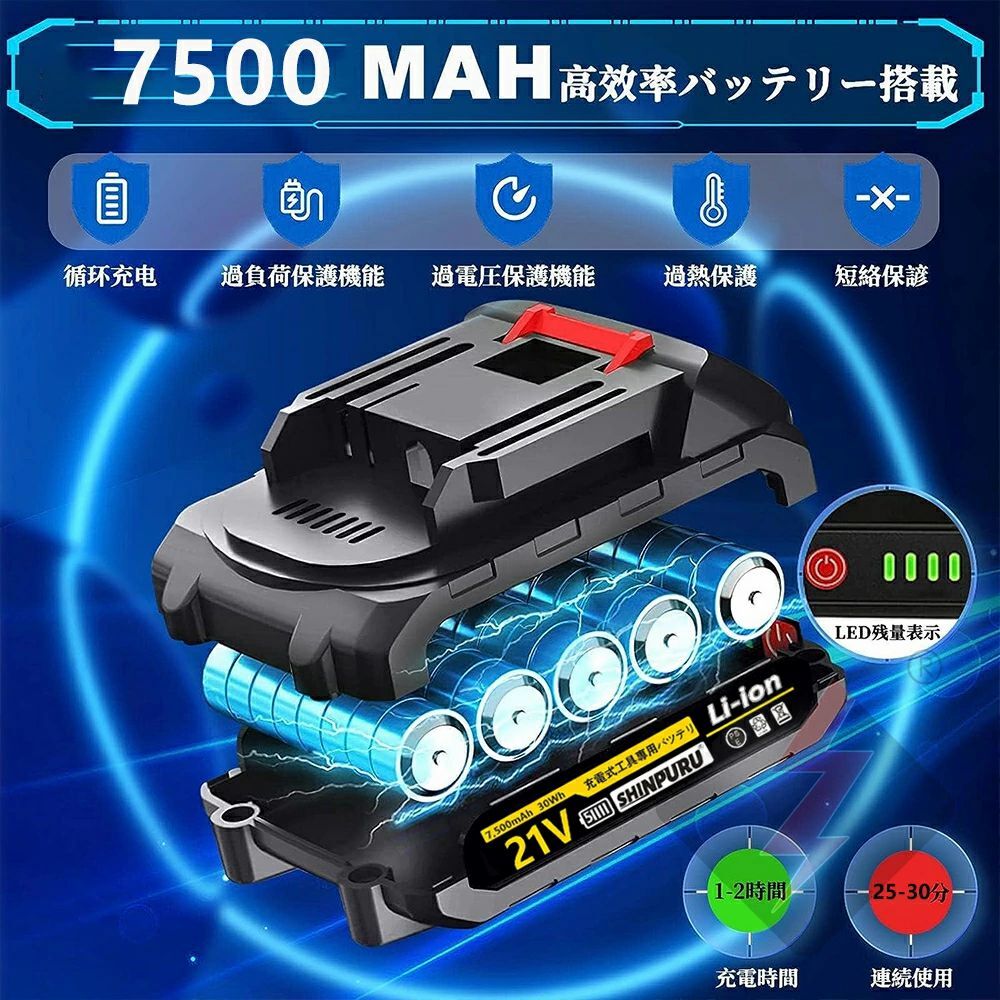 7500 mAh大容量バッテリ(別売り)。1本の電池を約25~30分間連続して使用することができる。具体的な使用時間は、使用者の使用習慣によって異なります。優れたコアを搭載し、耐久性が高く、長期使用が可能です。また、オーバーフロー、過充電、過放電を防止する保護回路も内蔵されており、安心して使用できます。マキタ18 V、20 V電池システム(BL 1820 b BL 1830 b BL 1840 b BL 1850 bなど)に対応