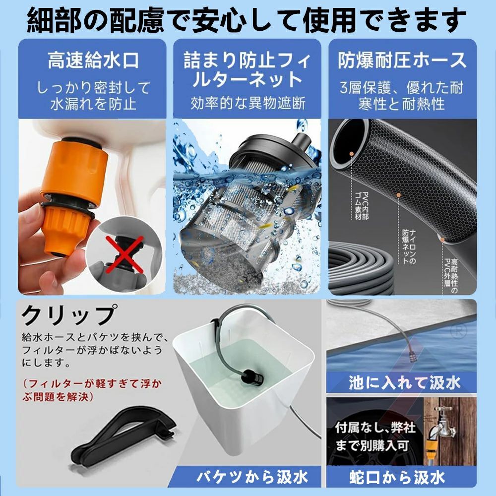 専用な水源の必要がなくて、池、バケツでも利用できて、面倒な水道栓の接続作業もなく洗浄の準備が簡単です。(*バケツが付属無し、別途で購入してください)