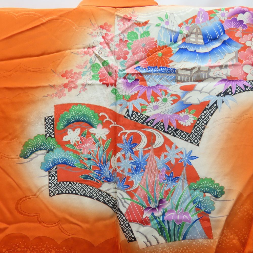中古 子供着物 祝い着 合成繊維 オレンジ マルチカラー 女の子 七五三 お宮参り 和装 呉服 和服 きもの