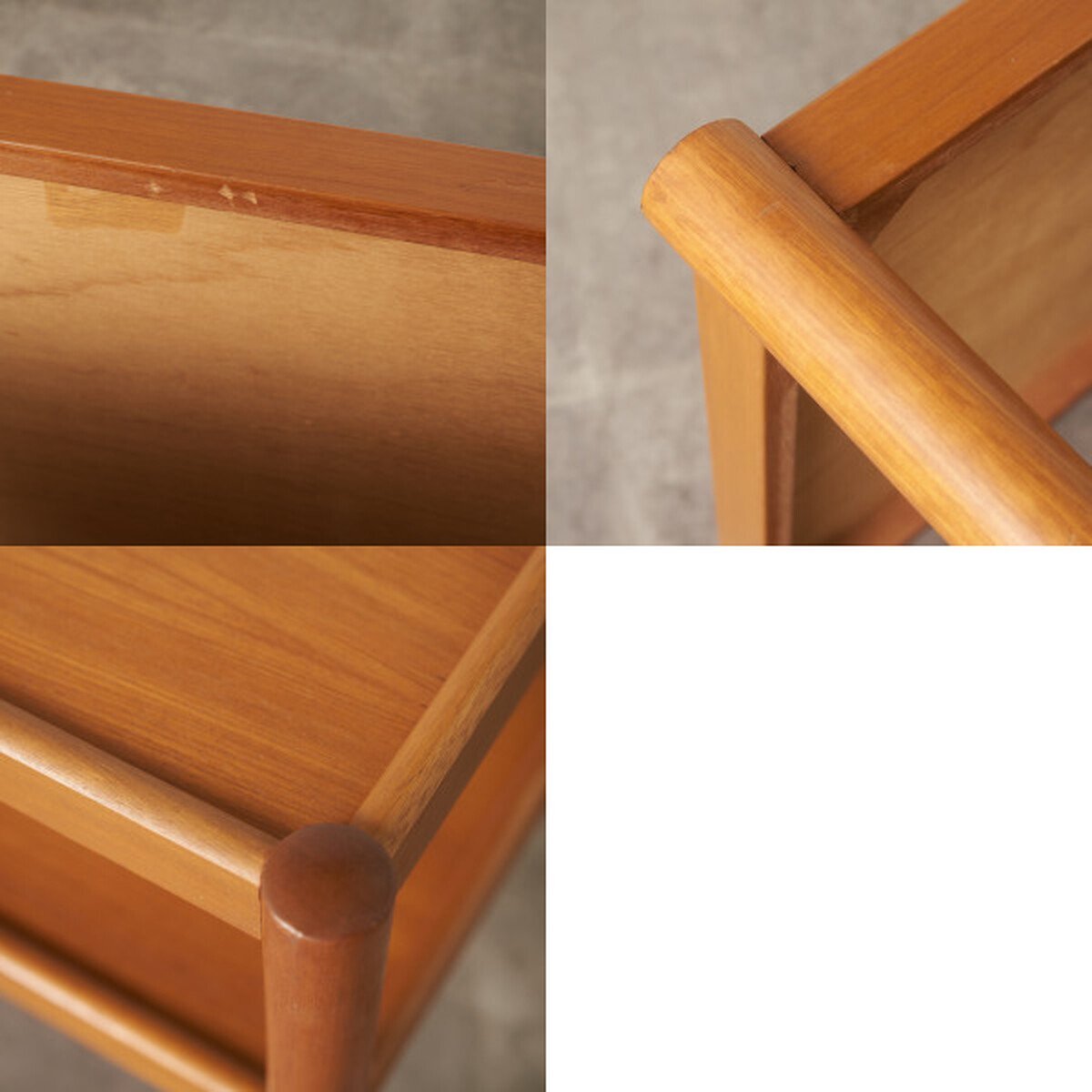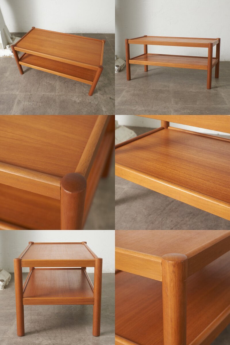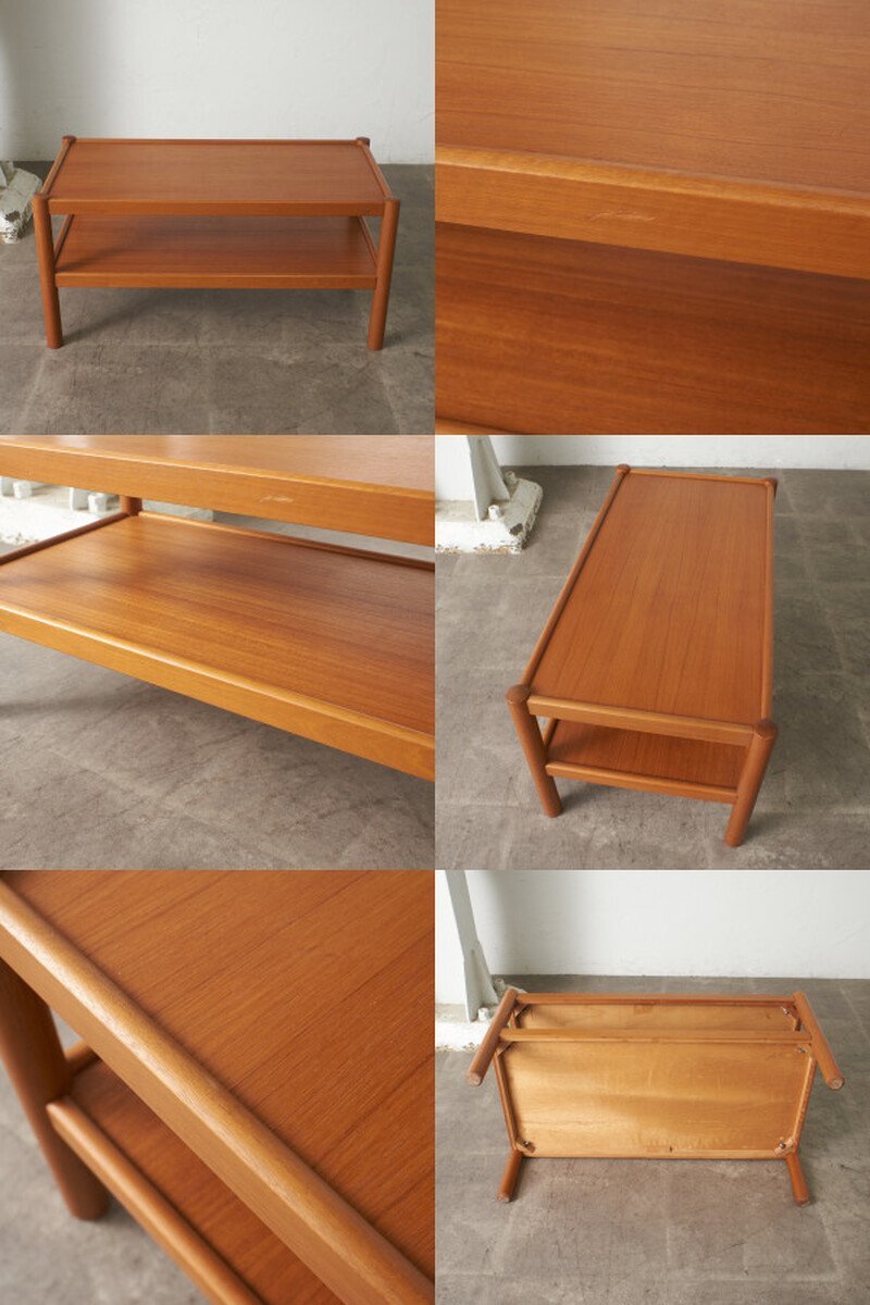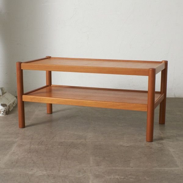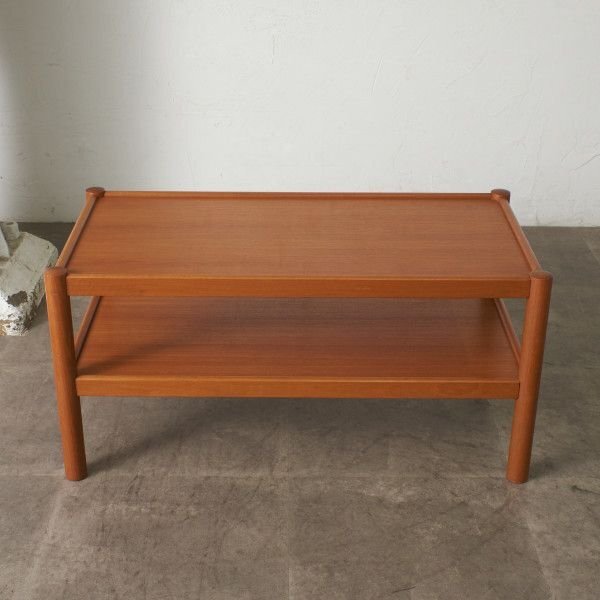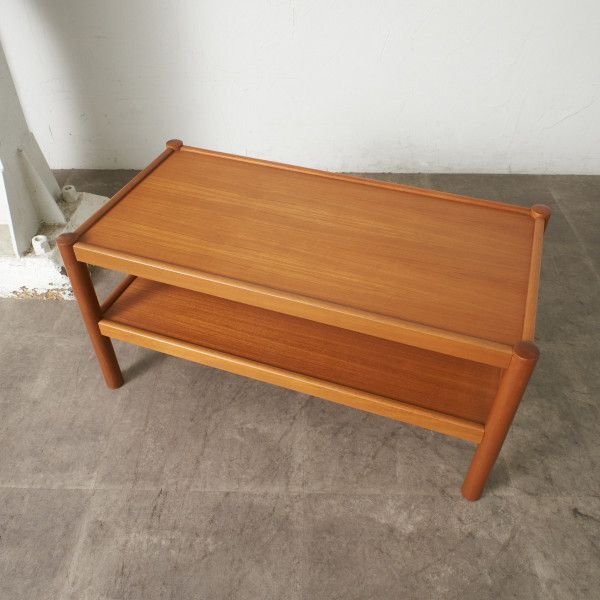温かみのある褐色の木肌が印象的なチーク材のコーヒーテーブル。天板下にはリビングまわりの収納に便利な棚が備わり、実用的でありながらも作り手のこだわりを感じさせるヴィンテージファニチャーです。