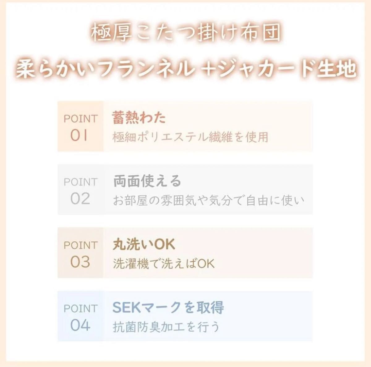 こたつ布団:サイズ:正方形・190X190cm。素材:表地:ジャガード;裏地:フランネル;詰めもの:ふかふかポリエステルワタ。
