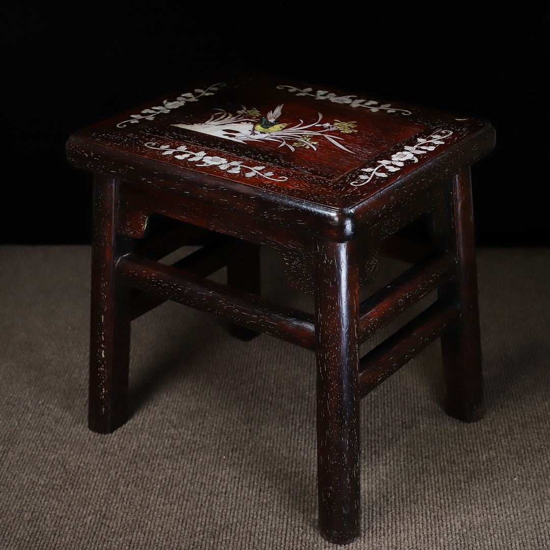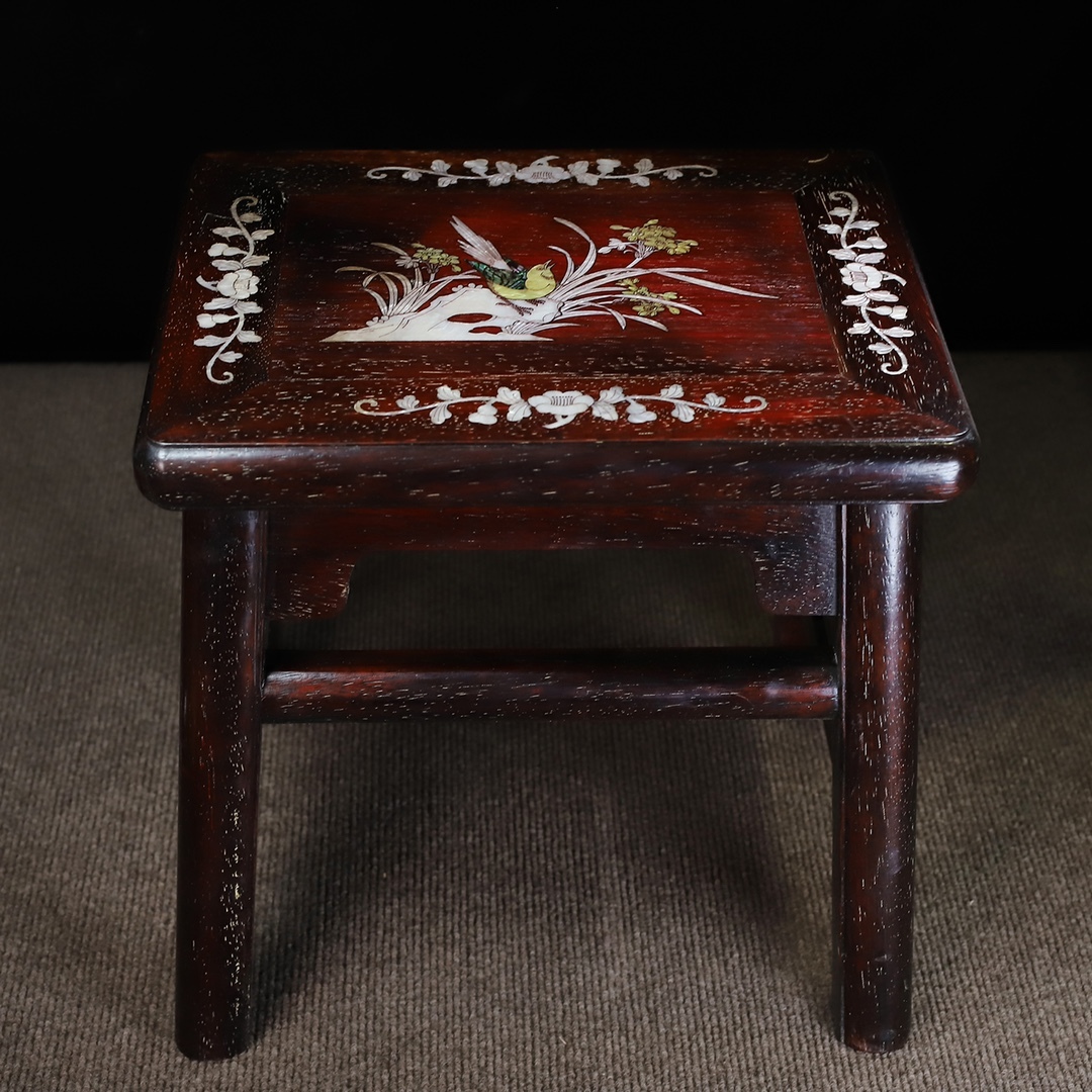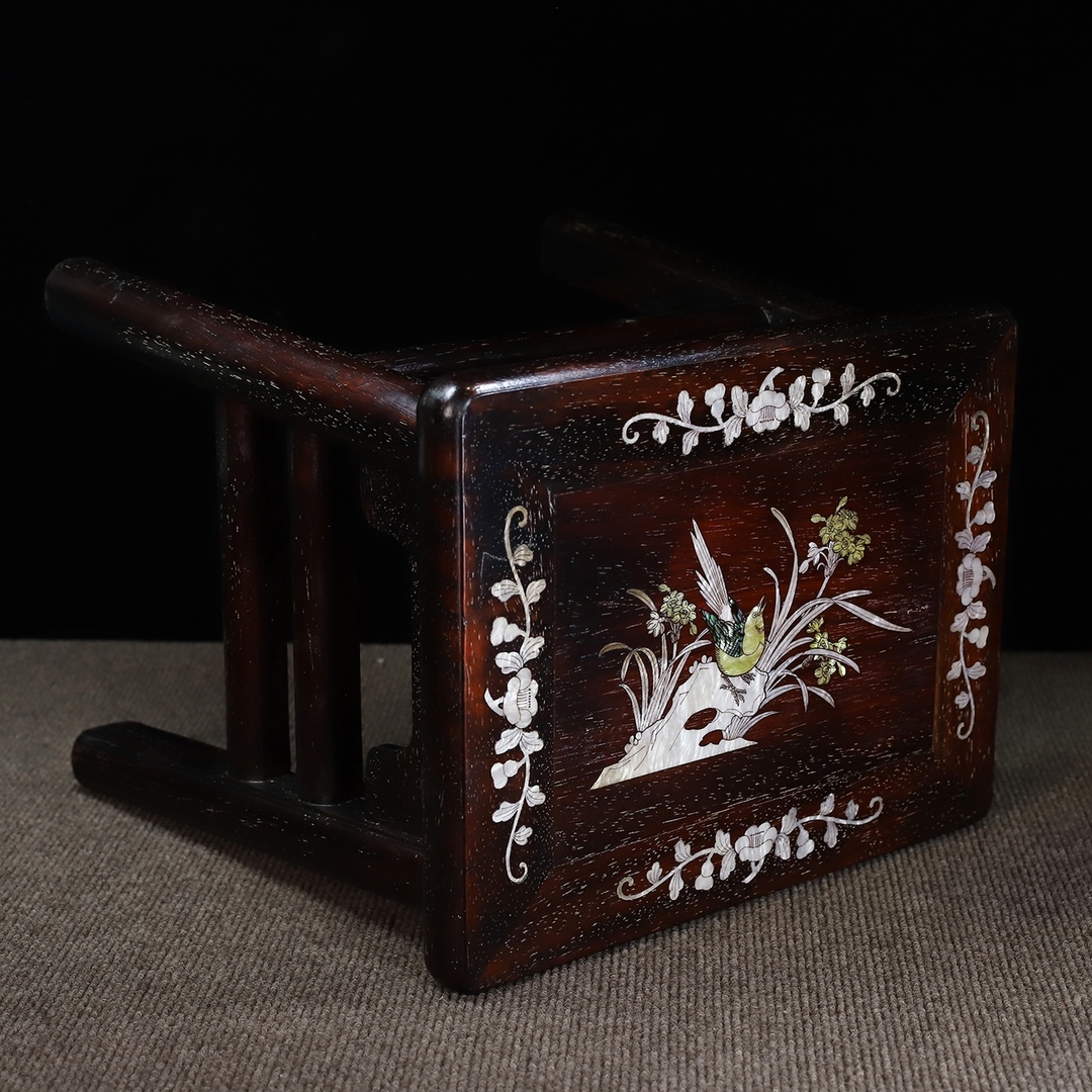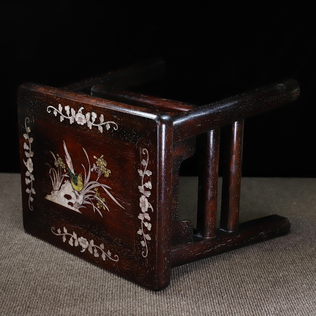 清時代 古紫檀木彫 嵌彩貝 花鳥紋 四方 富貴椅 椅子 擺件 家具 古玩家具 極細工 古賞物 古美味 東洋彫刻 時代物 骨董 中国古美術