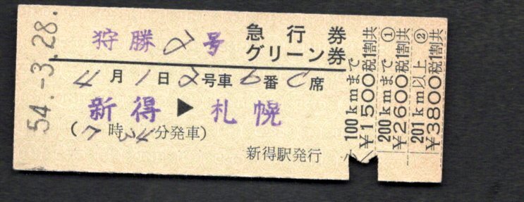 狩勝2号急行券グリーン券(新得駅)完全常備券
