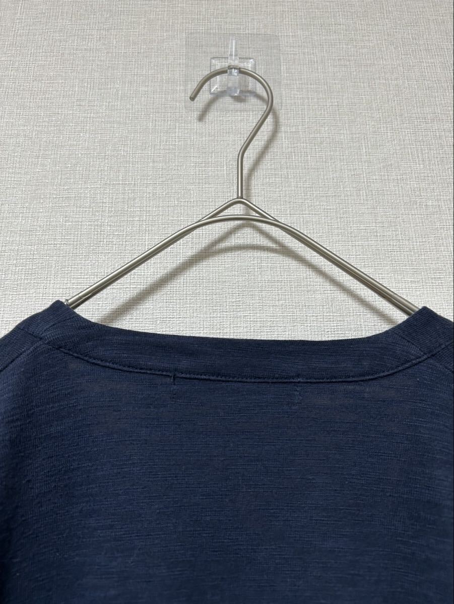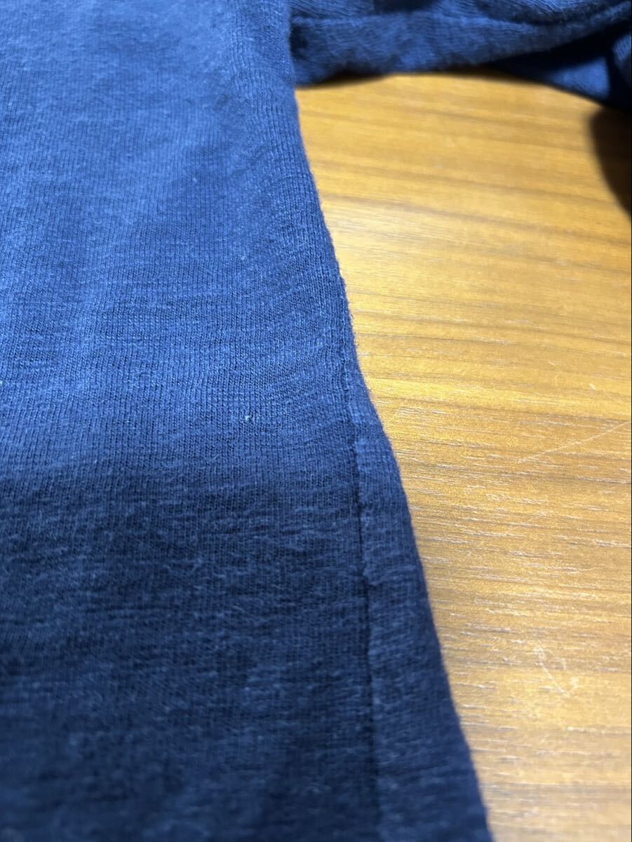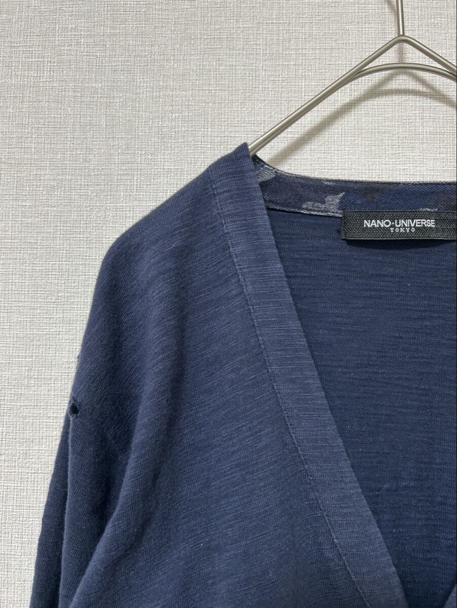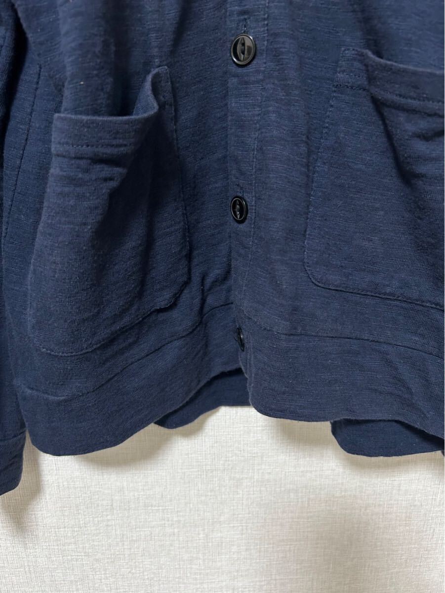 ネイビーのカーディガン、フロントポケット付き、袖に小さな穴あり。
