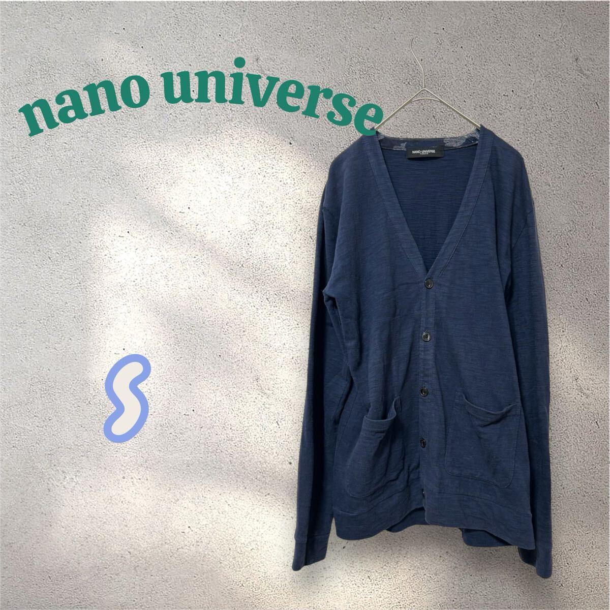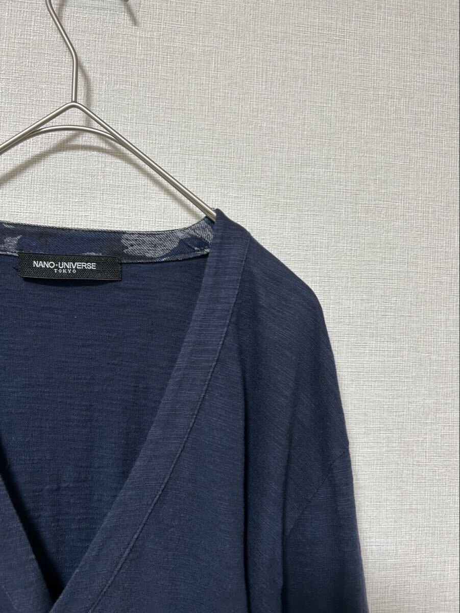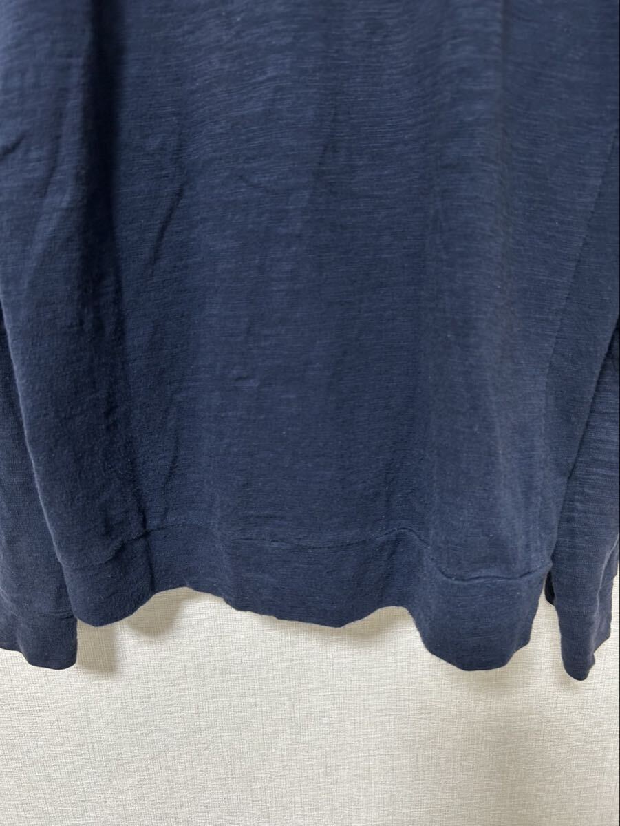 ネイビーのカーディガン、フロントポケット付き、袖に小さな穴あり。