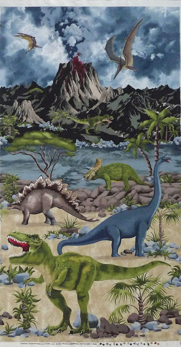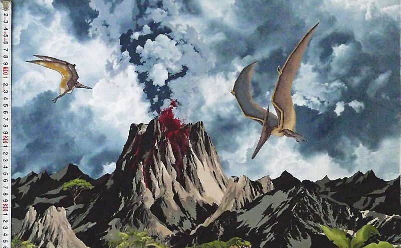 火山が噴火する古代の風景の中、ティラノサウルス、ステゴサウルス、トリケラトプス、プテラノドンなどを迫力満点に描いています。