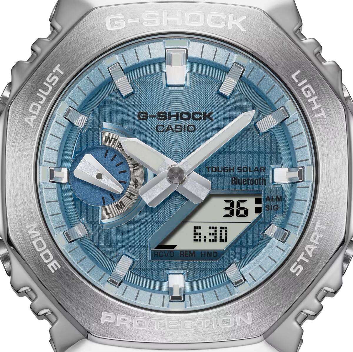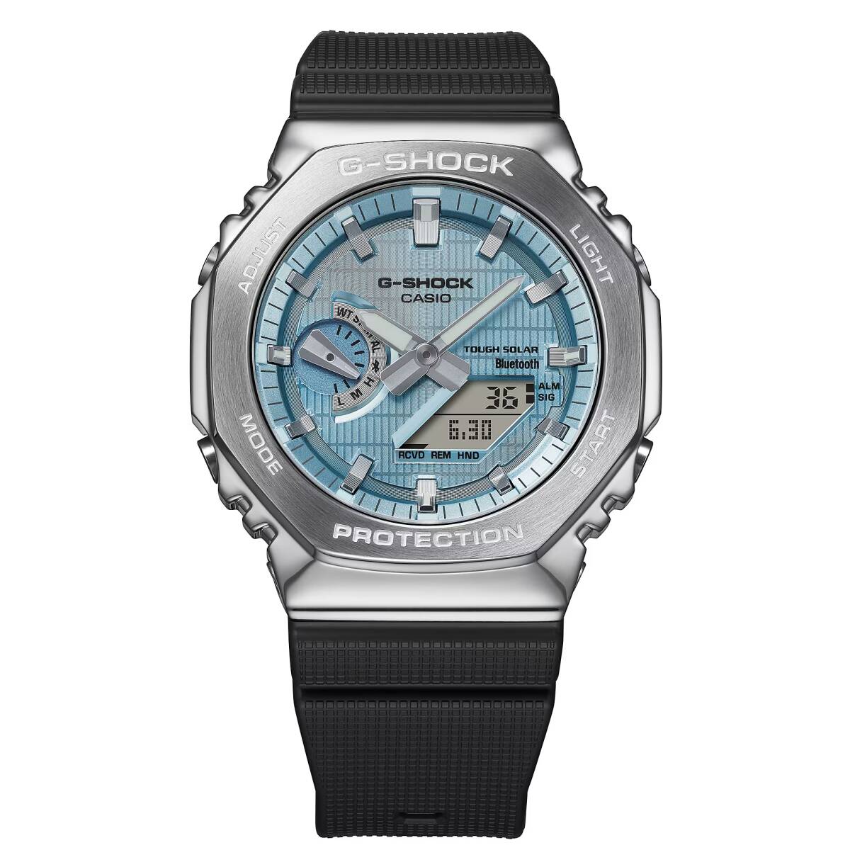GM-2100の八角形フォルムはそのままに、スマートフォンリンクとタフソーラーを搭載したメタルベゼルのモデルです。バンドにはバイオマスブラスチックを採用し、環境にも配慮しました。