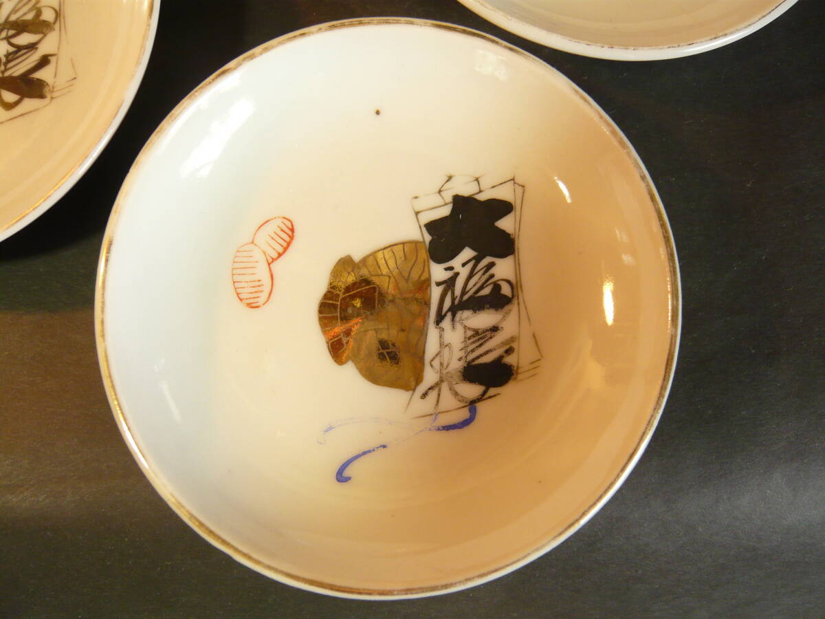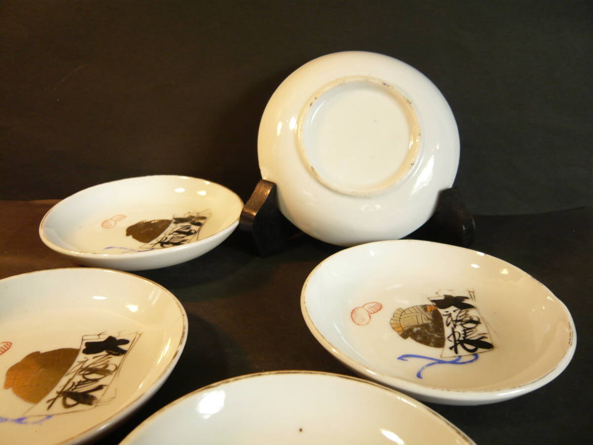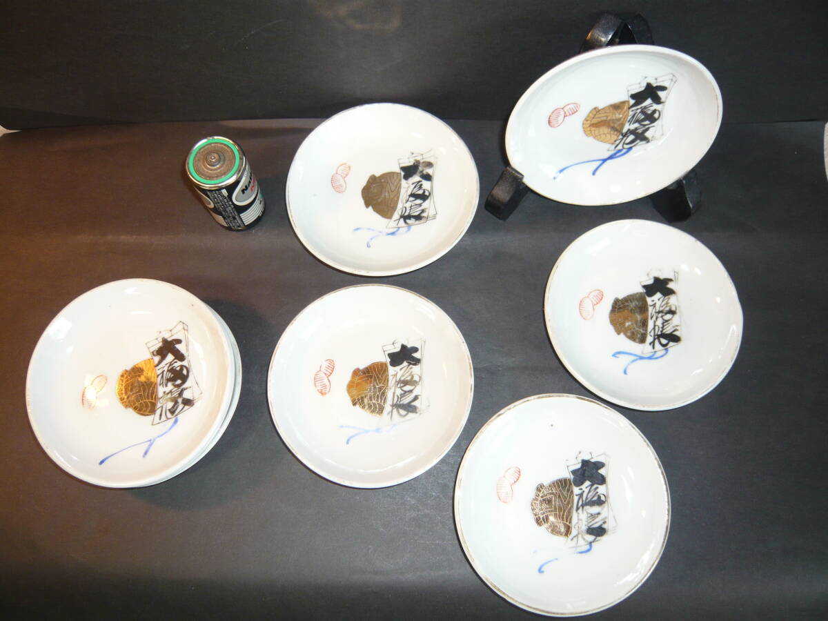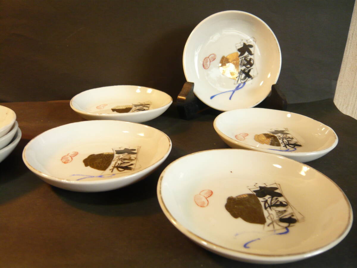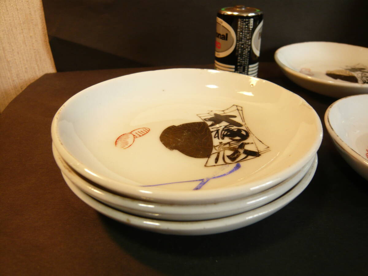 8枚とも傷はありませんが、使い込まれて図柄に擦れのあるものもあります。サイズは、直径約11.2センチ、底径約6.5センチ、高さ約2.2センチです。焼き物としては「瀬戸焼」でしょうか?