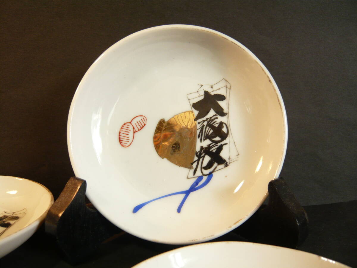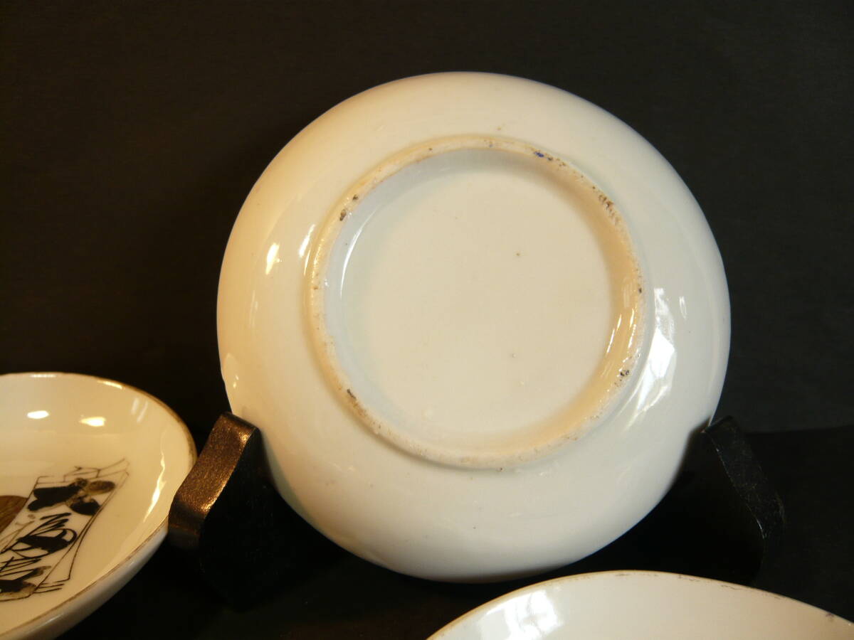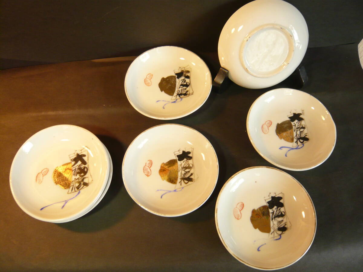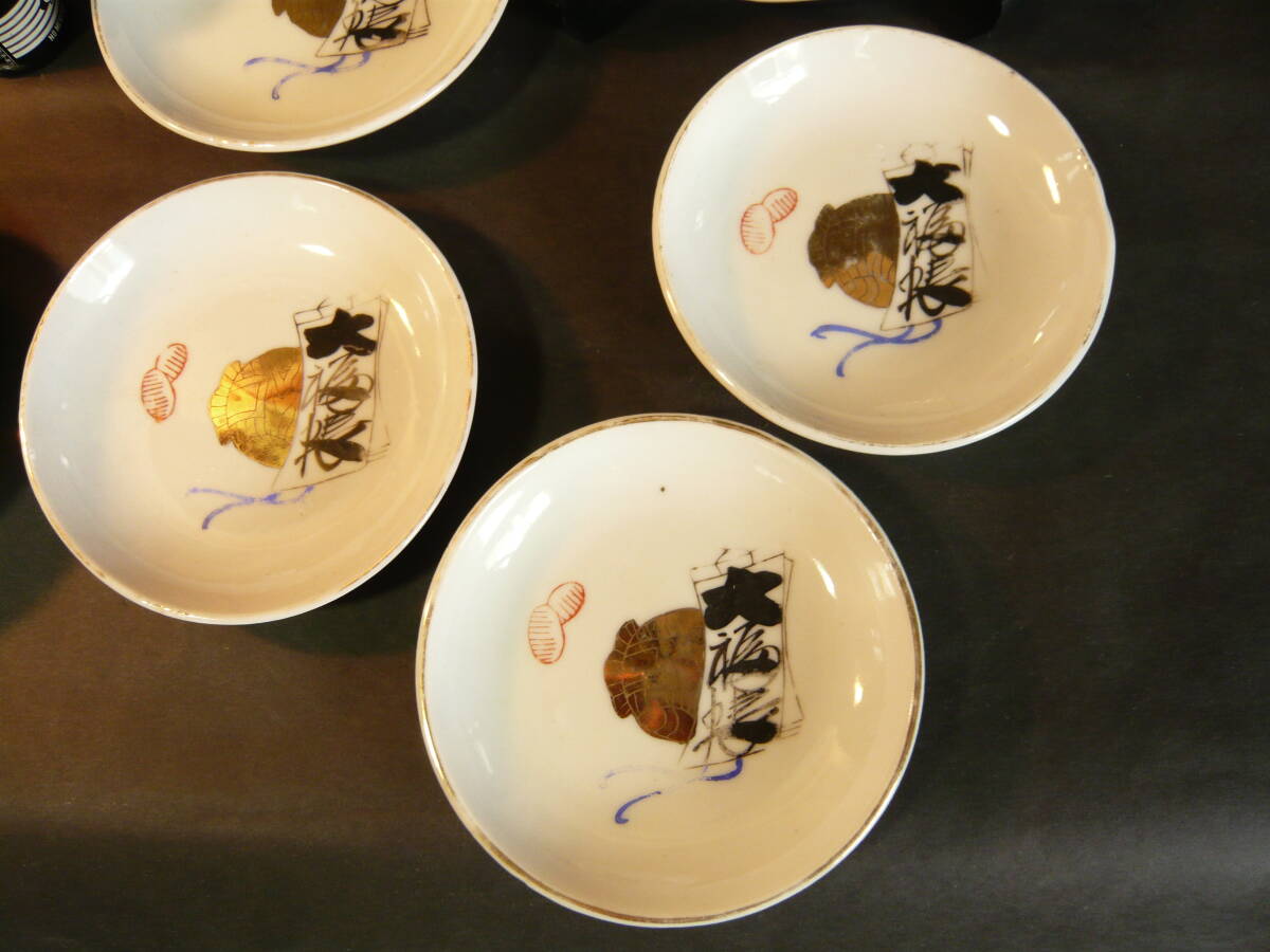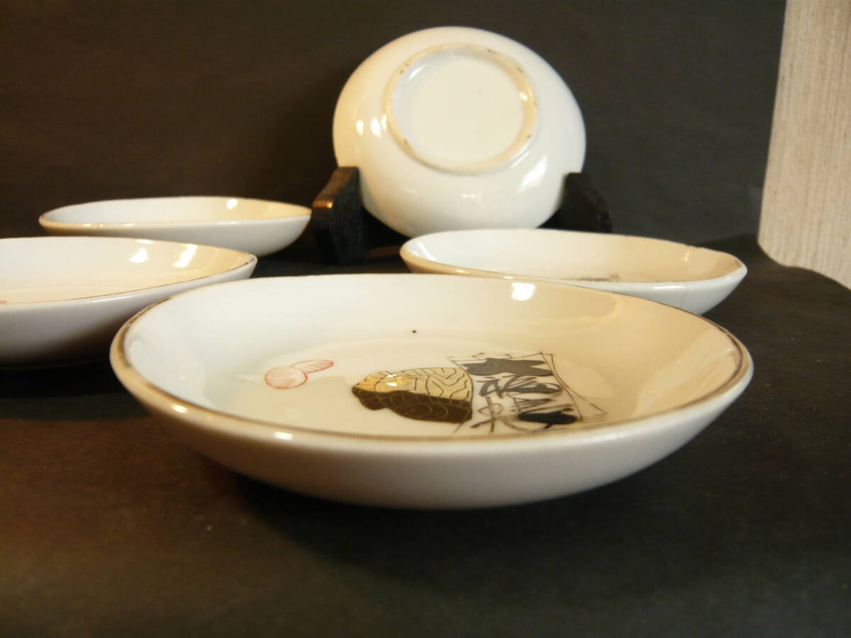 8枚とも傷はありませんが、使い込まれて図柄に擦れのあるものもあります。サイズは、直径約11.2センチ、底径約6.5センチ、高さ約2.2センチです。焼き物としては「瀬戸焼」でしょうか?