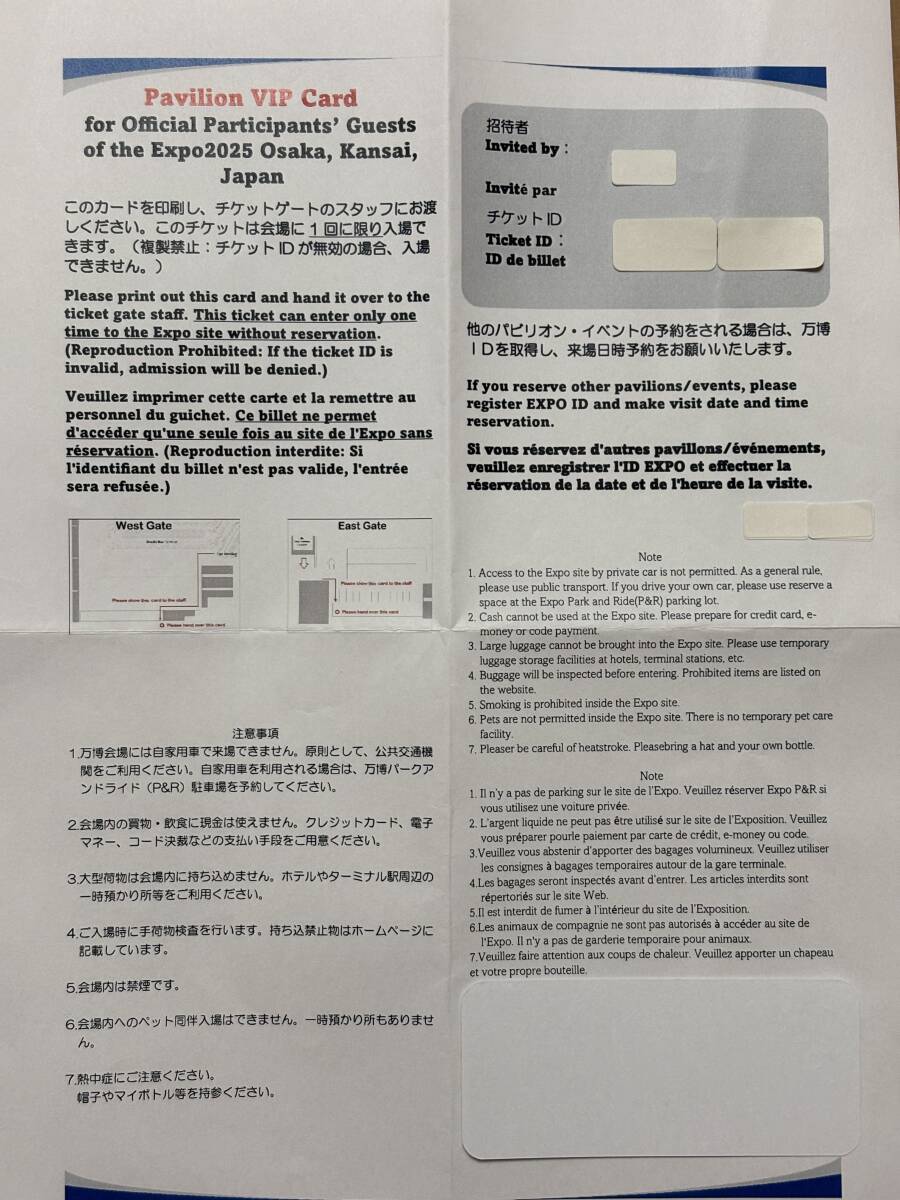 大阪・関西万博のVIPゲートから入場できる券です。別途の来場予約は必要ありませんが、入場時にこのカードは回収されます。優先的に入れるパビリオンはありません。予約が必要なパビリオンに行かれる場合は、万博IDを取得後に個別に予約をする必要があります。