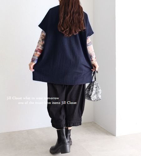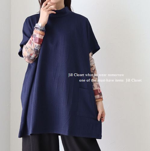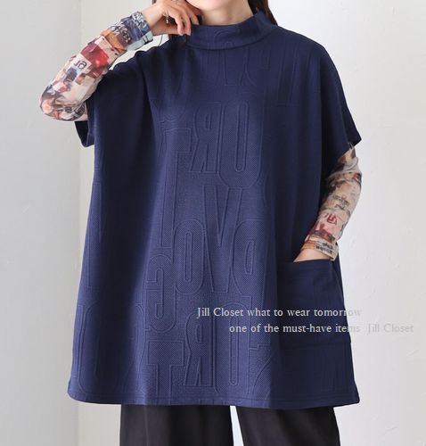 お洒落な程よい厚みのエンボス加工。重ね着レイヤードスタイルに最適のストレッチ素材。ゆったりとしたノンストレスな着心地。気になるお腹周りやヒップもカバー出来ます。パンツにもスカートにもマッチするお役立ちアイテム。人気のボトルネックで首元もカバー◎フロント片側のみポケット付き。
