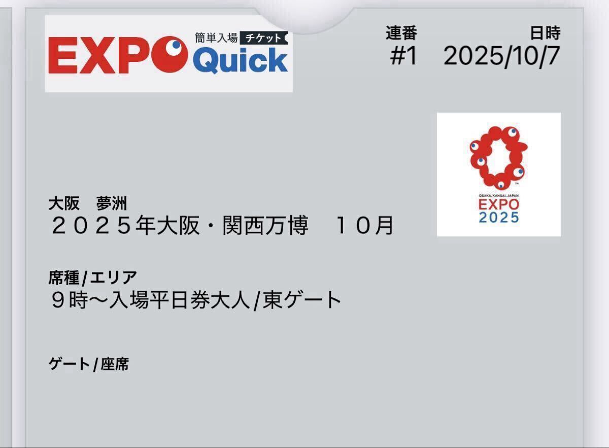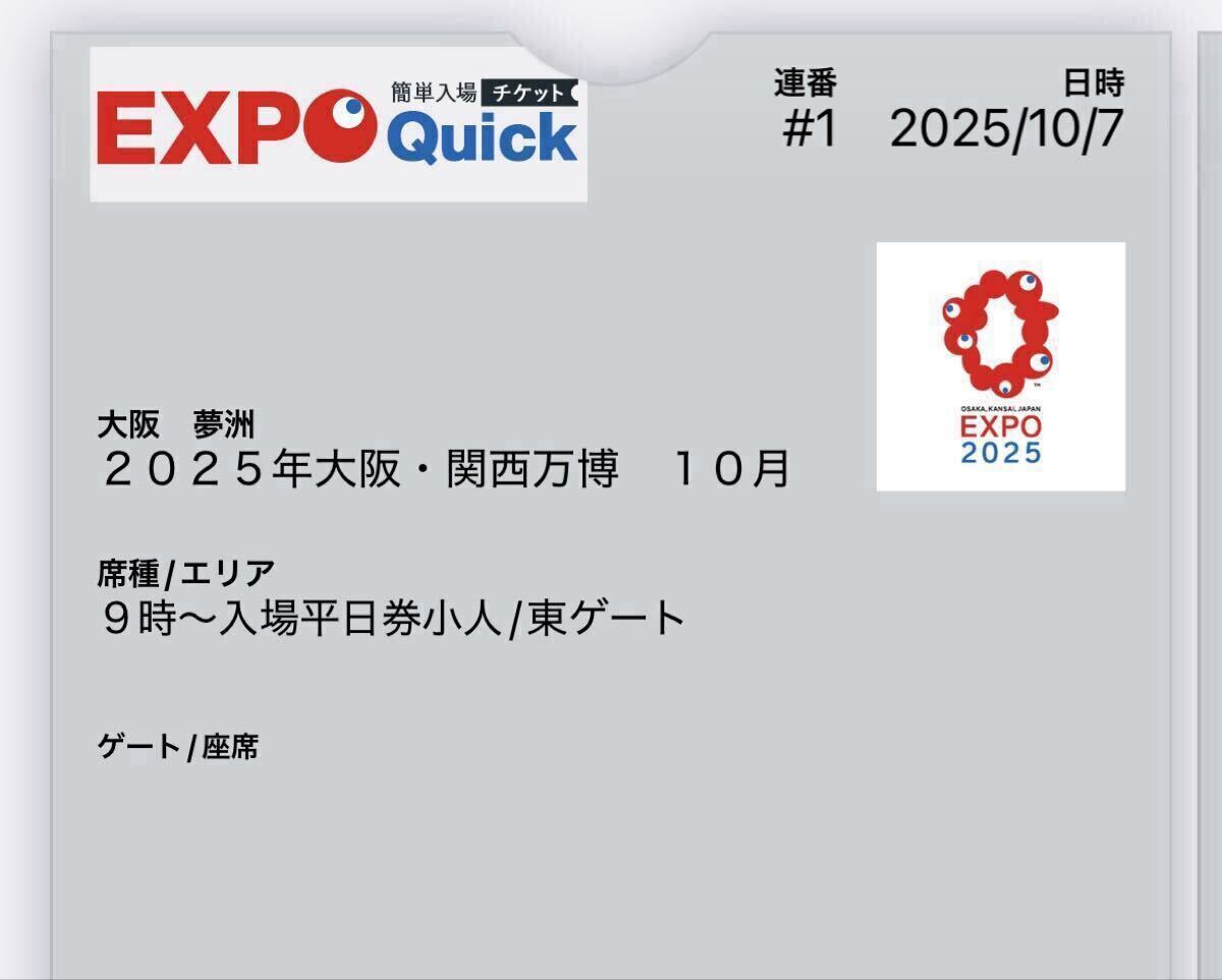 2025大阪・関西万博の10月7日(火)東ゲート9時入場の予約済みチケット大人一日券1枚、子供一日券1枚の2枚セットになります。