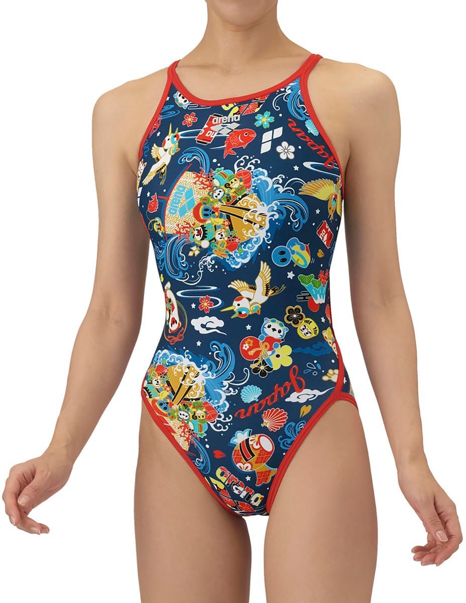 詳細 | トレーニングカテゴリー「TOUGHSUITシリーズ」。大会に向けて練習を重ねる頻度が高いスイマーにオススメの練習用水着。環境に配慮したリサイクルポリエステル素材「タフスキンEP」を使用し塩素に強く長持ち。全てのスイマーに人気のアリーナくんの総柄ワンピースタイプ。日本の縁起の良い和柄と海と親和性のある宝船がポイント。宝船が象徴する繁栄や幸運が着用するスイマーたちへ届くよう願いを込めたデザイン。アリーナくんと仲間たちが七福神になっている遊び心を表現。前身頃、後身頃共に黒の裏地付き。※この商品は縫製上、一点一点プリント柄の見え方に違いが生じますので予めご了承ください。 NVRDネイビー×レッド SS,S,M,L,O 水着 スイムウエア オープンバック 水泳 競泳 スイミング スイム プール フィットネス トレーニング 練習 タフスキン ハードトレーニング レディース 女性 大人 |