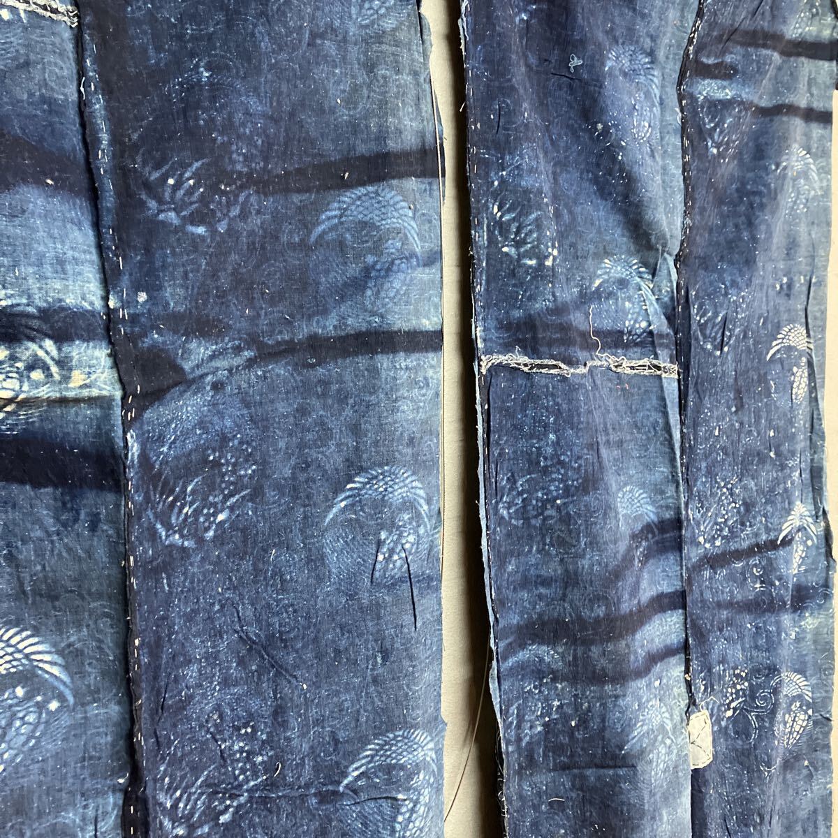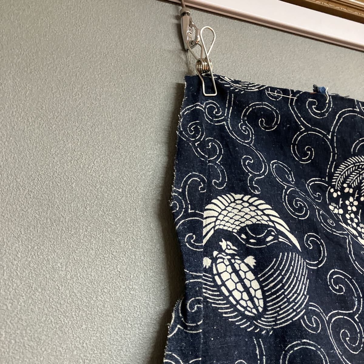 (a) Ma314 木綿藍染2枚セット 鶴亀 松竹梅 唐草 4幅 当時物 古布 木綿 藍染 型染 リメイク素材 120×166 450g コレクター放出品