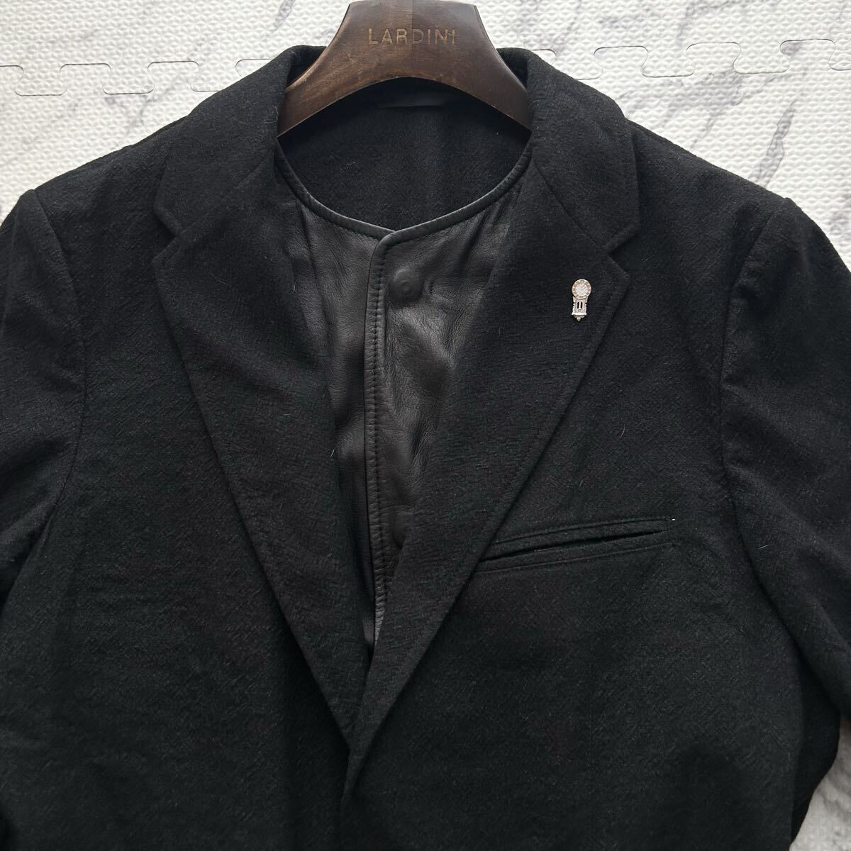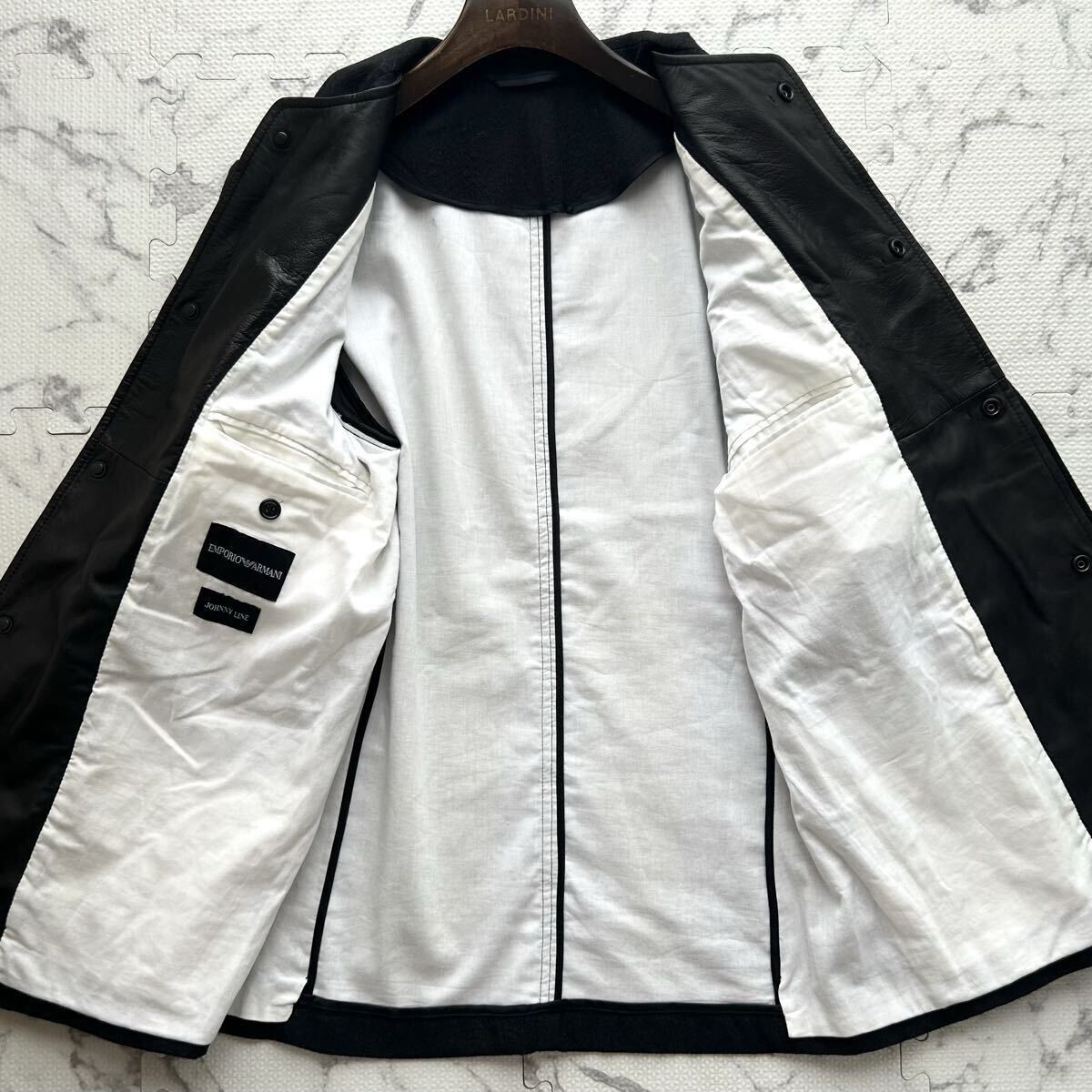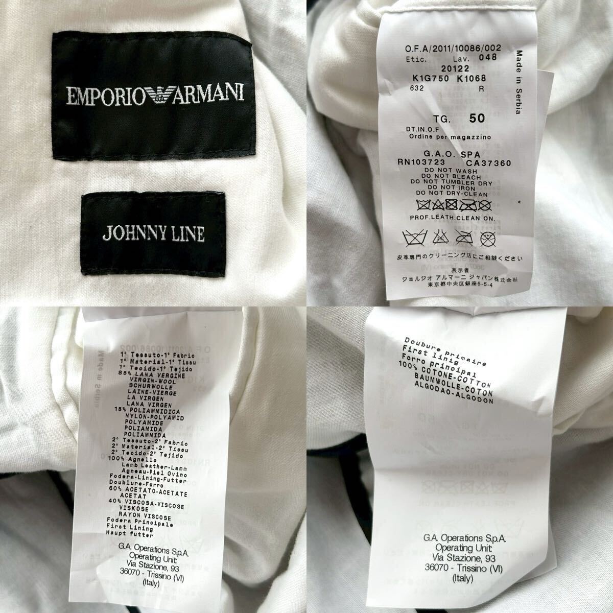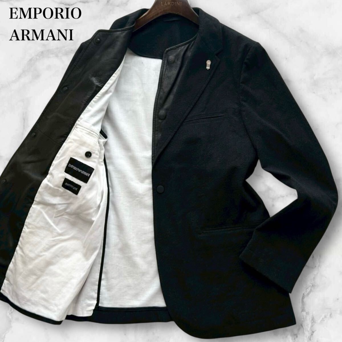 美品/XL相当●EMPORIO ARMANI エンポリオ アルマーニ JOHNNY LINE ラムレザー切替 羊革 テーラードジャケット ラペルピン付 ブラック 黒 50