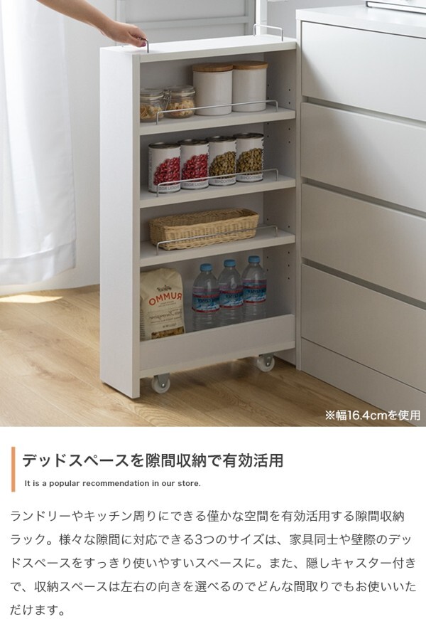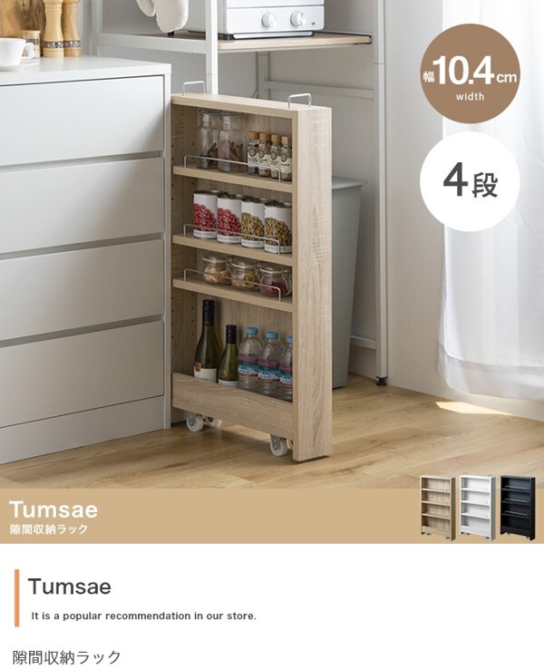 ※現在ご覧の商品ページはホワイトのご購入ページとなります。 ヤフオクの仕様上単一ページに複数バリエーションを掲載することができませんので、他バリエーションが希望の場合は別ページでご購入お願い致します。 デッドスペースを有効活用できる『Tumsae(トゥムセ)』幅10.4cm隙間収納ラック。 ランドリーやキッチン周りでできる僅かな隙間にぴったりフィットし、見た目もすっきりと使いやすいスペースに。 様々な場所で大活躍できるよう3つの幅をご用意しているので、使いたい場所に合わせてお選びただけます。 隠しキャスター付きで、収納スペースは左右の向きを選べるので、どんな間取りでもお使いいただくことが可能です。 配達業者を指定いただくことはできません。 沖縄・離島に関しましては、別途配送料が必要となります。 北海道への配送も別途配送料が必要になる場合がございます。 ※別途送料が発生する場合は後ほどご連絡させていただきます。 タイミングによっては在庫切れの場合があります。