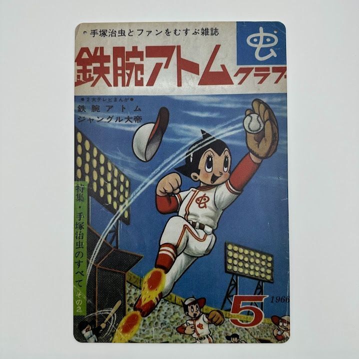 鉄腕アトムが描かれた1966年の野球デザインのブリキ看板です。
