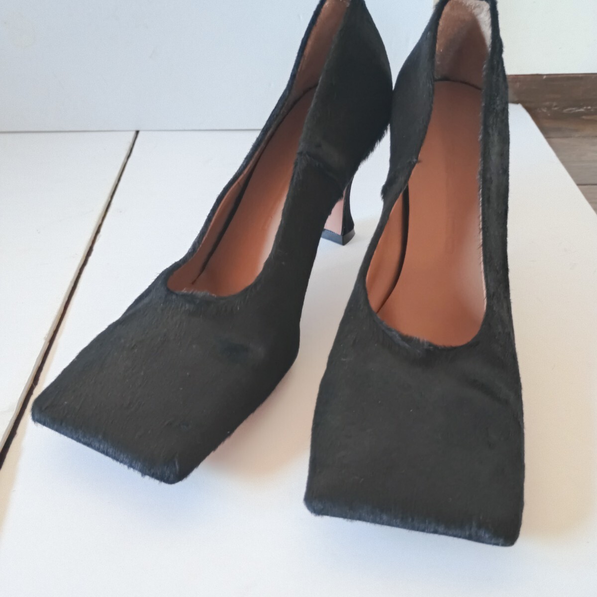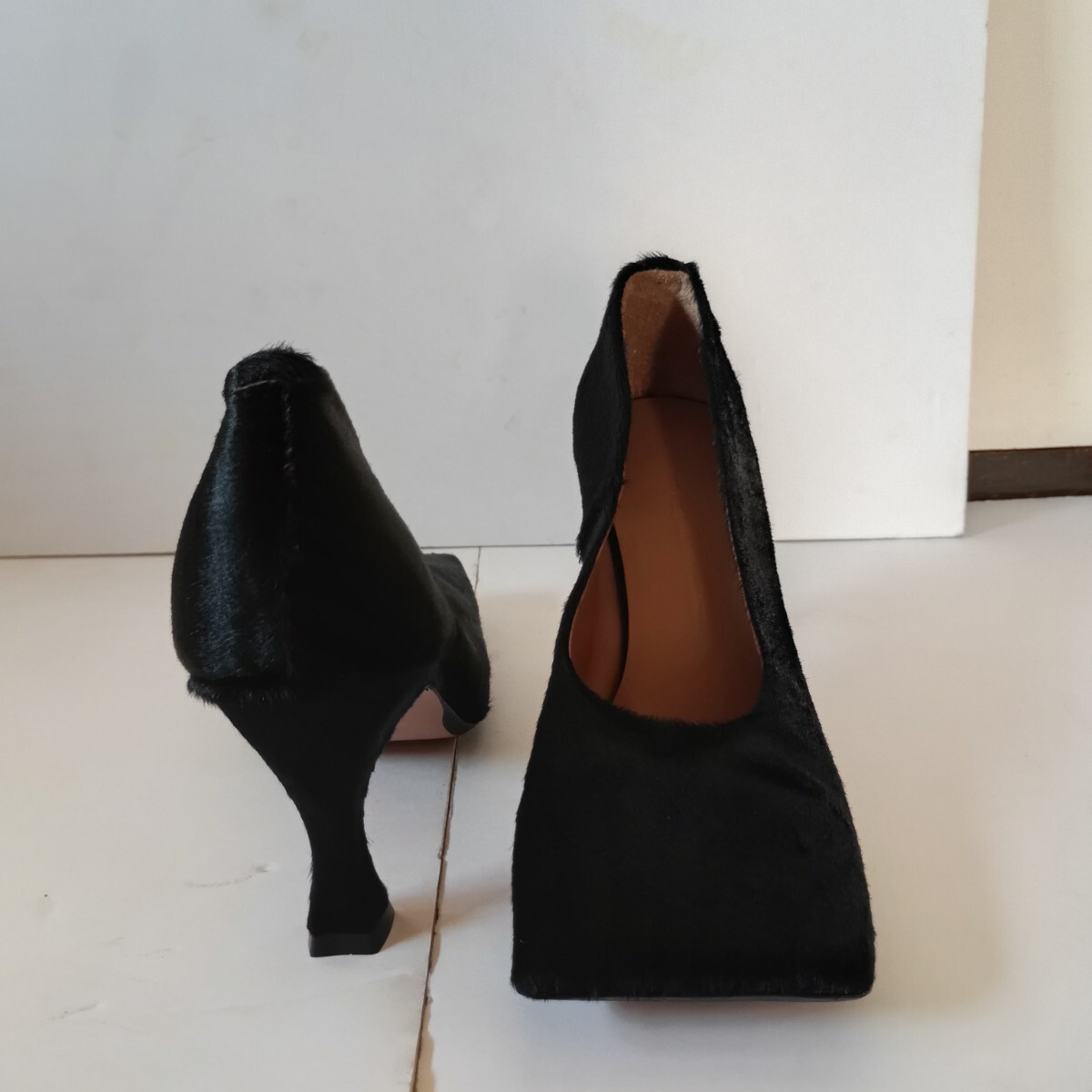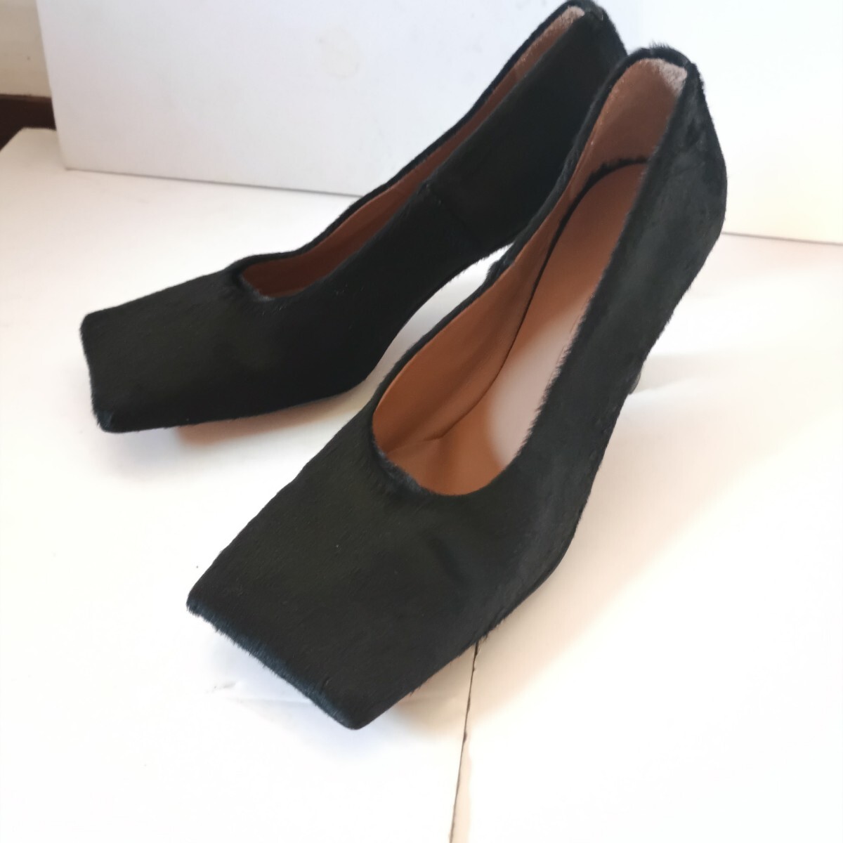 ファブリック素材 ハラコ素材の黒いスクエアトゥハイヒール、エレガントでモードなデザイン。