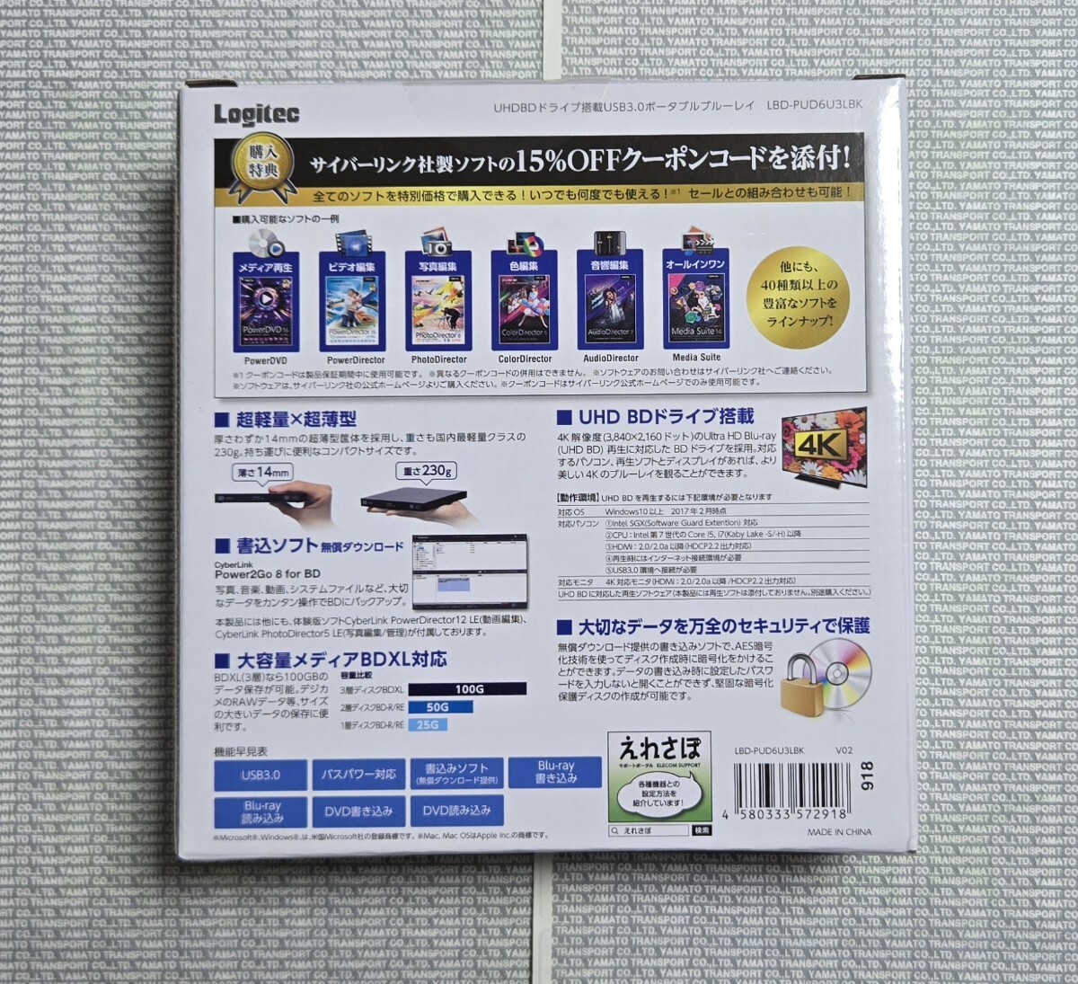 ほぼ新品 Logitec UHD 外付け ブルーレイディスクドライブ 9.5mm LBD-PUD6U3LBK 動作品 M DISC BDXL 超薄 BU40N