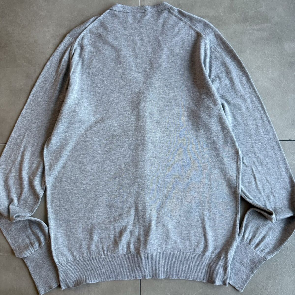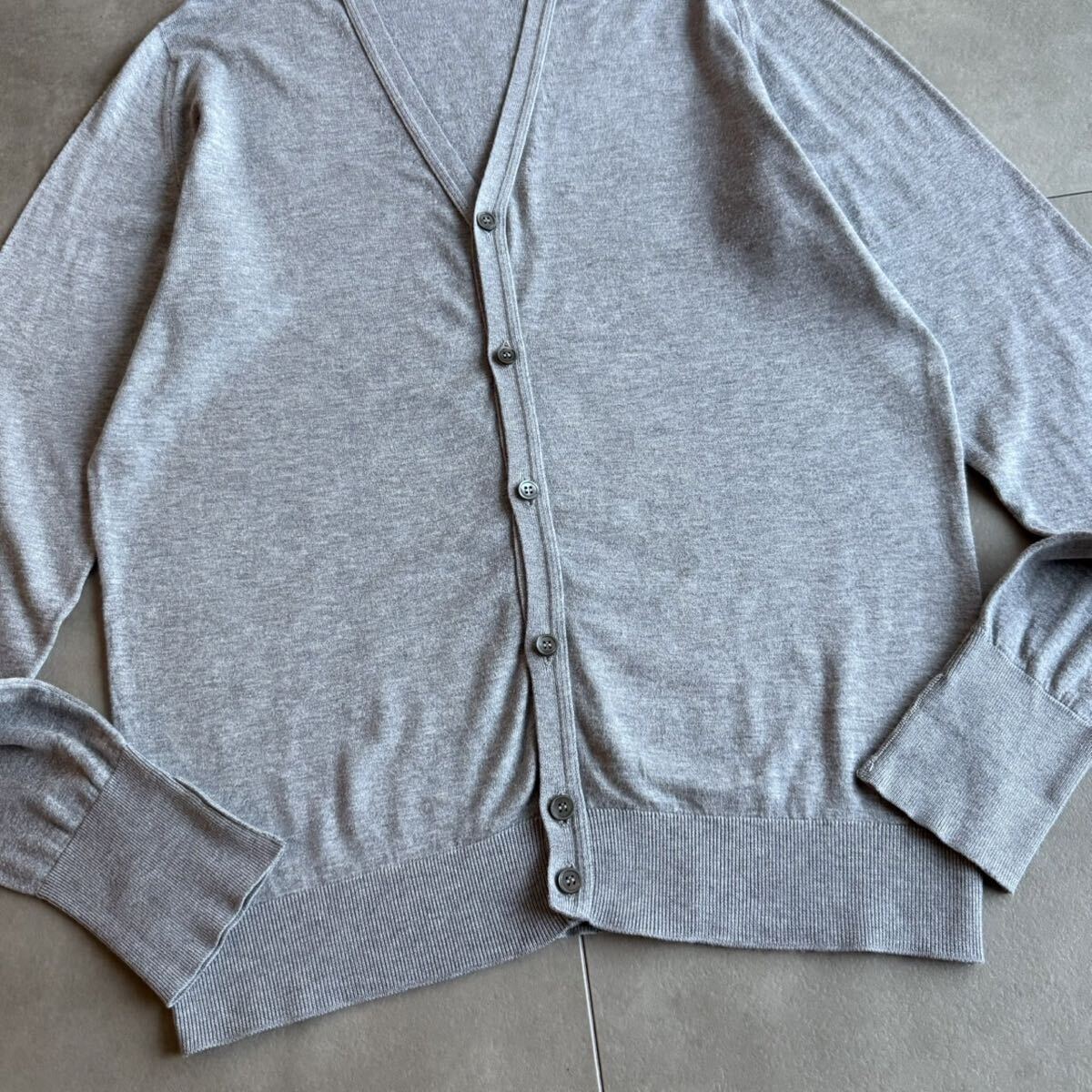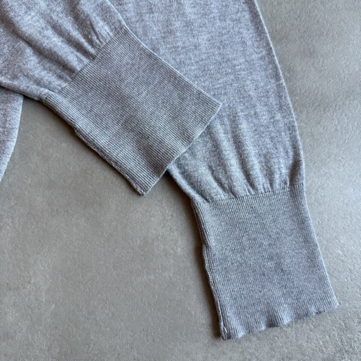 こちらは、軽やかで上品なライトグレーカラーのVネックカーディガン。30ゲージという極細の編み立てにより、シルクのような光沢としなやかな肌触りを実現。薄手ながらも耐久性に優れ、季節を問わず快適に着用できるのも魅力です。