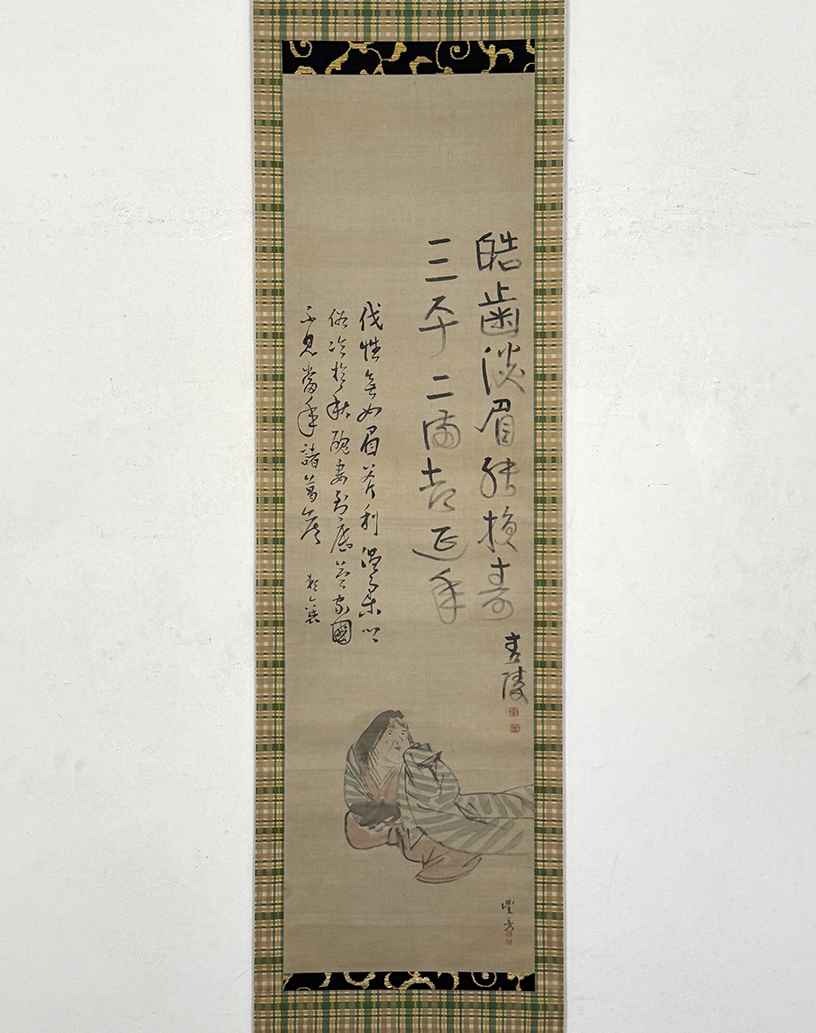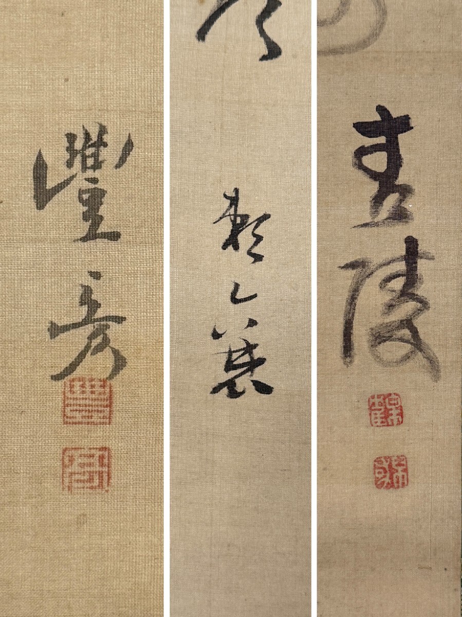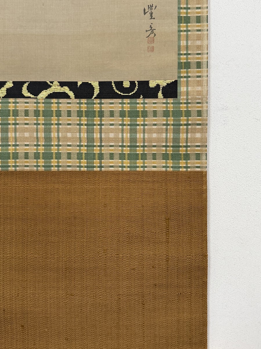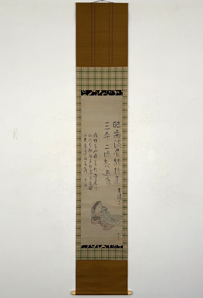 総丈サイズ…横 33 × 縦 186.5 cm 絹本着色・箱入 頼潔箱書 状態…本紙微少シミ 【印刷ではありません】 【真作】 岡本豊彦 江戸後期の絵師。備中生。字は子彦、通称を司馬、号に繭村・鯉喬等。呉春のもとで研鑽を積み、山水・人物画が特に優れたことで知られる。松村景文と四条派の双璧を成し、「花鳥は景文、山水は豊彦」と称された。他同門には柴田義董・小田海僊など。呉春の死後は「澄神社」と呼ばれる画塾を開き、その門人からは柴田是真・塩川文麟・田中日華らが出た。弘化2年(1845)歿、73歳。 頼山陽 江戸後期の儒者・勤王家。また、歴史家、思想家、漢詩人としても活躍した。大坂生。広島藩儒頼春水の長男。名は襄、字は子成。通称を久太郎、別号に三十六峰外史。母や叔父杏坪から教育を受け、幼少時から詩文の才能を発揮。初め杏坪について広島で学び、江戸で尾藤二洲・服部栗斎に師事。のち京都に出て私塾を開き、書斎山紫水明処を営む。著書の『日本外史』は幕末の尊皇攘夷運動に影響を与え、日本史上のベストセラーとなった。中林竹洞・浦上春琴・田能村竹田・江馬細香ら多くの文人墨客と交わった。天保3年(1832)歿、53歳。 海保青陵 江戸時代中期~後期の経世家。江戸出身。本姓は角田。名は皐鶴。字は万和。通称は儀平。宇佐美灊水に徂徠学をまなぶ。一時名古屋藩などに仕官したほかは各地を歴遊して講説。晩年は京都で塾をひらくかたわら『稽古談』『万屋談』などをあらわす。藩財政の危機打開のため、産業の開発、藩専売制の採用などの重商富国策を説いた。文化14年(1817)歿、63歳。 頼潔 頼山陽の次子・頼支峰の第一子。山陽の孫にあたる。名は龍三、字は庫三。漢学者。 |