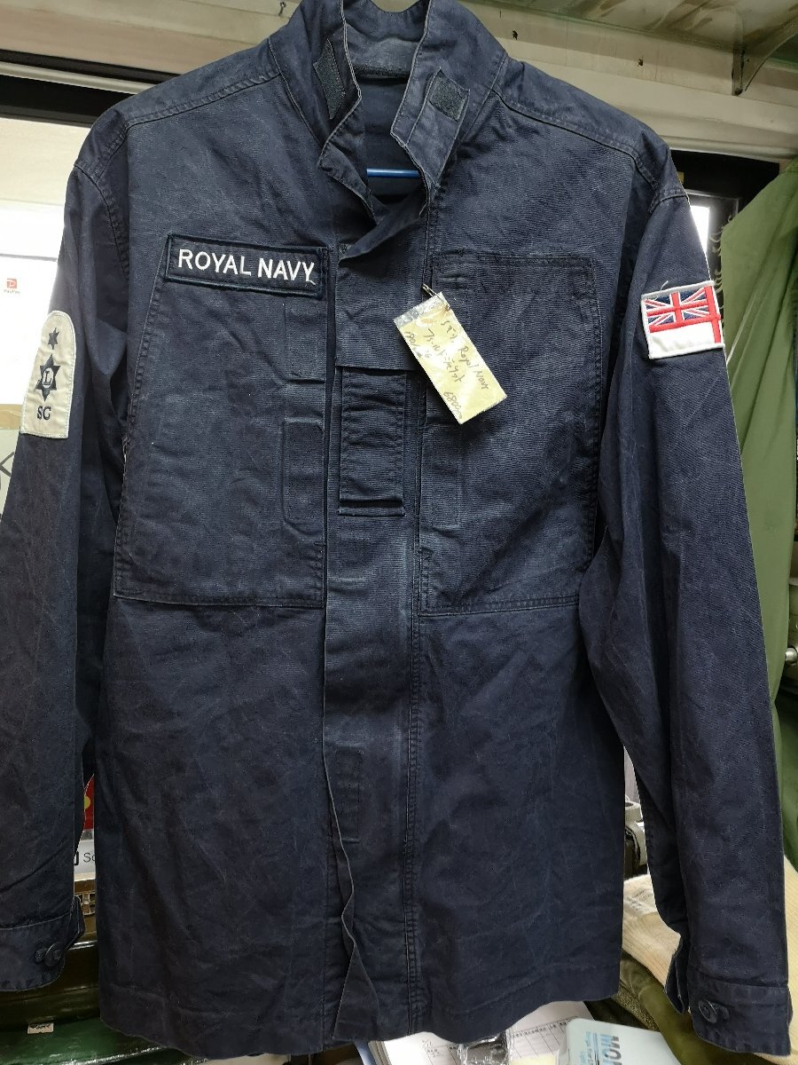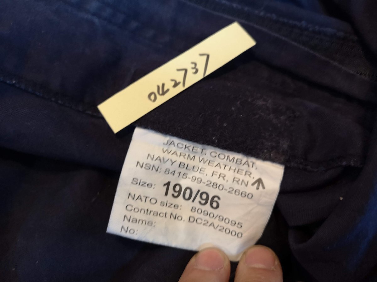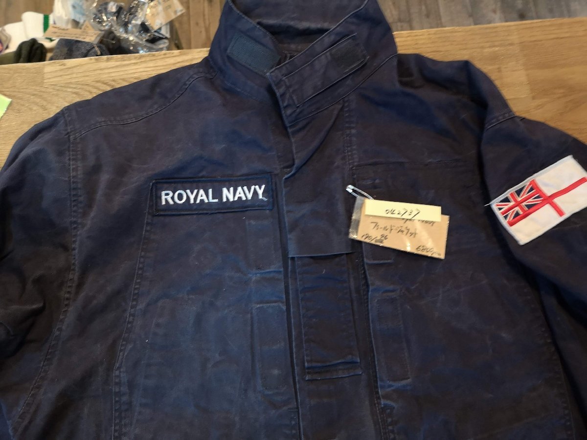 90年代イギリス海軍(ロイヤルネイビー)のコンバットジャケットです。No.4 Working Dressに含まれるアイテムです。ネイビーカラーの生地は薄手ではありますが、強度のあるポリコットンで頑丈ながら軽くて羽織りやすくなっています。フロントはジッパーとベルクロの二重開閉比翼仕様。胸元の左右にはポケットがあり、こちらもベルクロで開閉できます。左右の胸のポケット内にはペン用ホルダーも備わっています。右胸に「ROYAL NAVY」タブ、左腕にイギリス海軍の軍艦旗ワッペンが付いています(余分についているものや逆についていないものもあります)。また胸元には階級章などのタブを装着するためのエポレットがあります。 年々注目度の上がっているイギリス軍のアイテムの中でも気軽に取り入れやすいアイテムの1つです。 ●素材:コットン75% ポリエステル25% ●状態:ユーズド 190/96( 身幅56cm/肩幅51cm/着丈83cm/袖丈68cm程度です。 ) 沖縄離島を除く全国500円でお送りいたします。落札価格にプラスでお願いします。