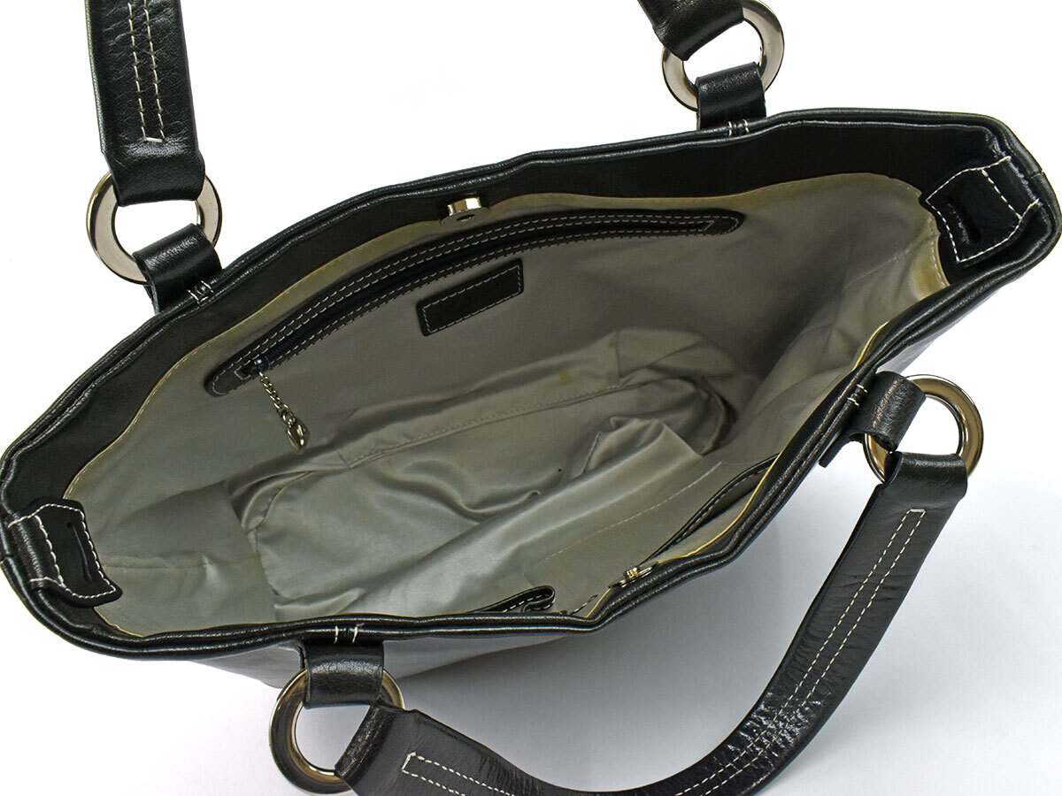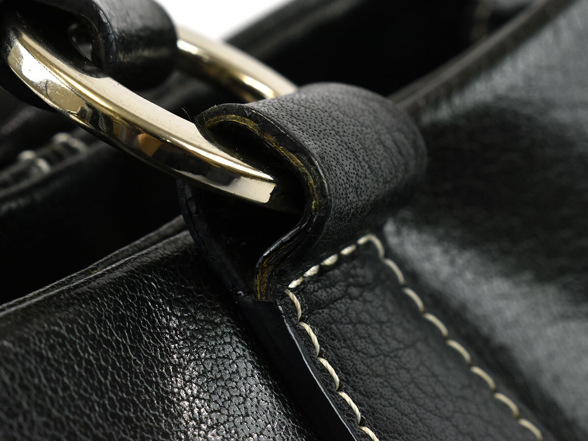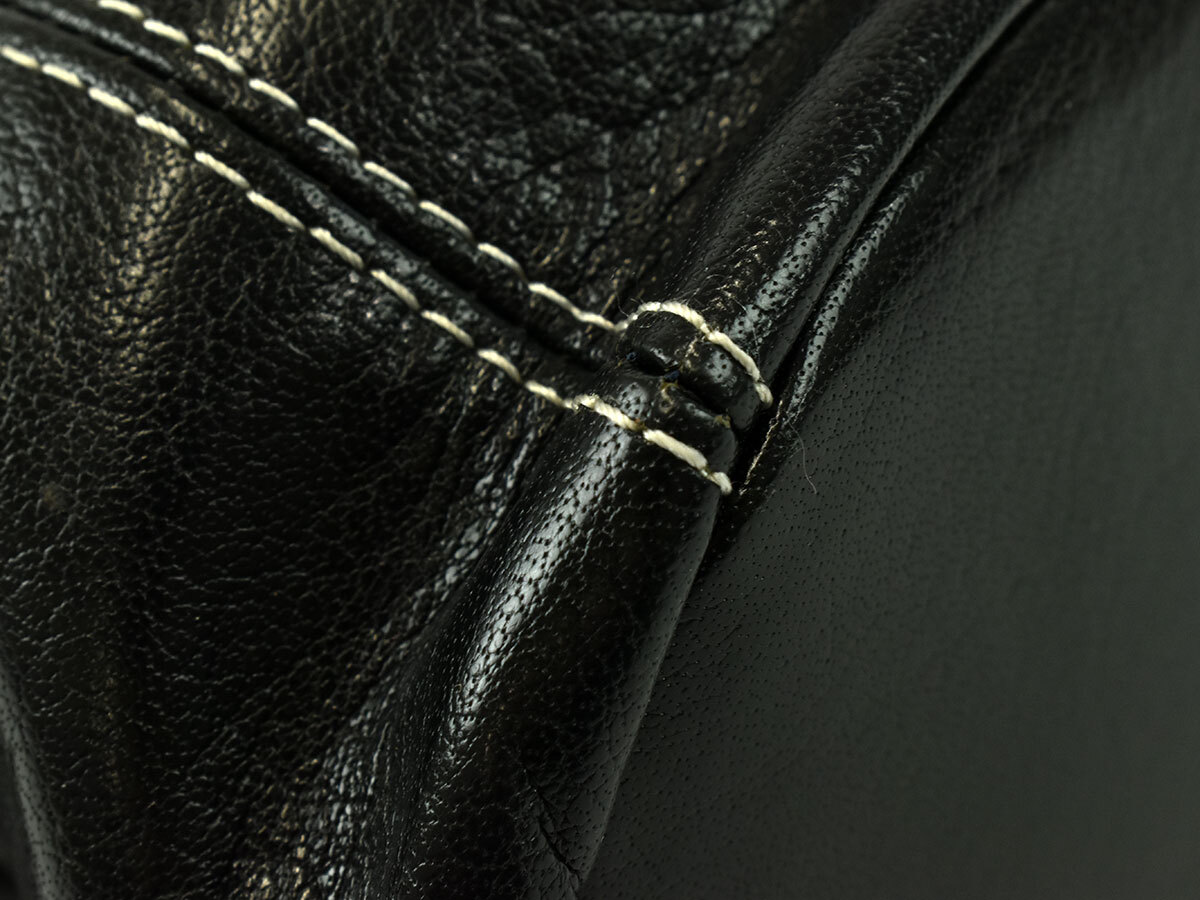 持ち手の根元部分に割れ・剥がれ、内側の広範囲に変色・シミ、金具に若干のスレがございます。 内側にやや使用感が窺えますが、ご使用には差し支えなくまだまだお使い頂ける商品です。 |