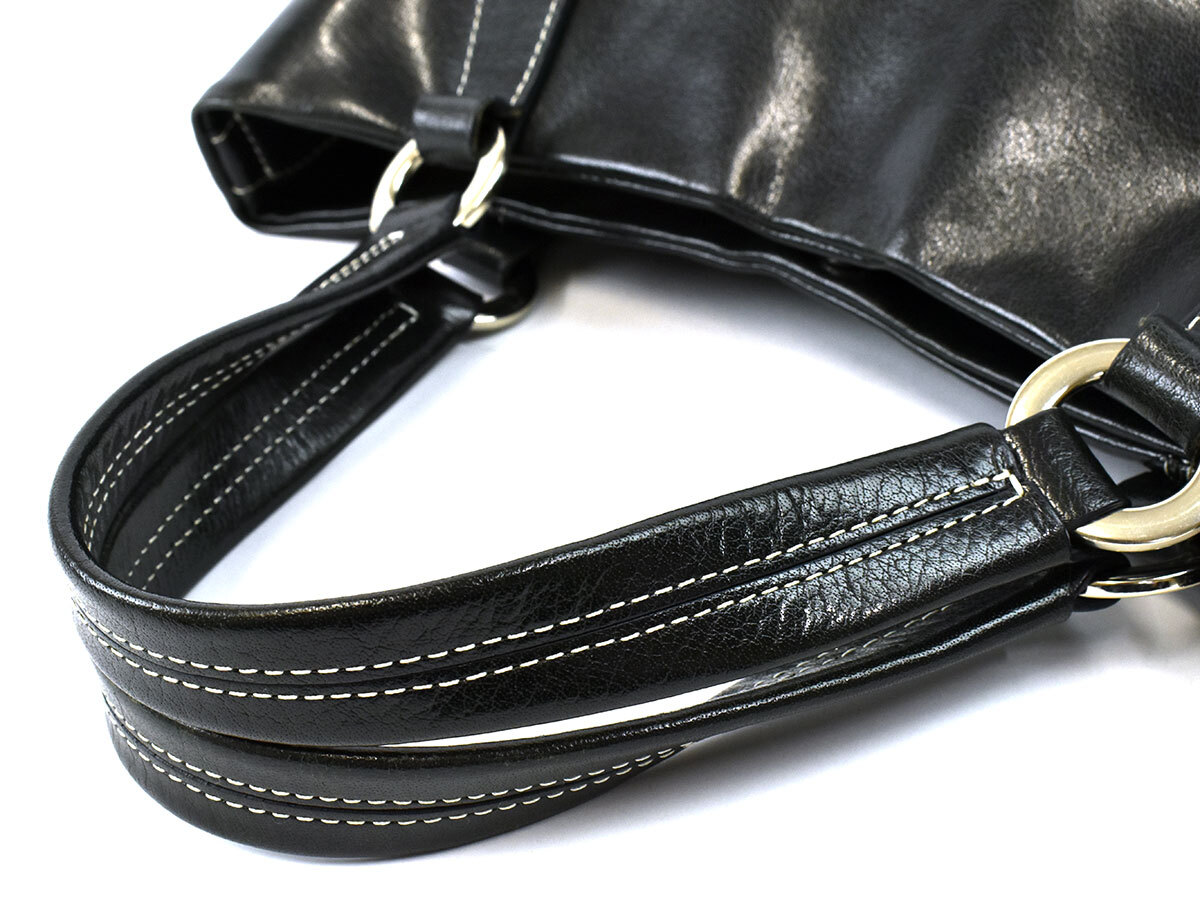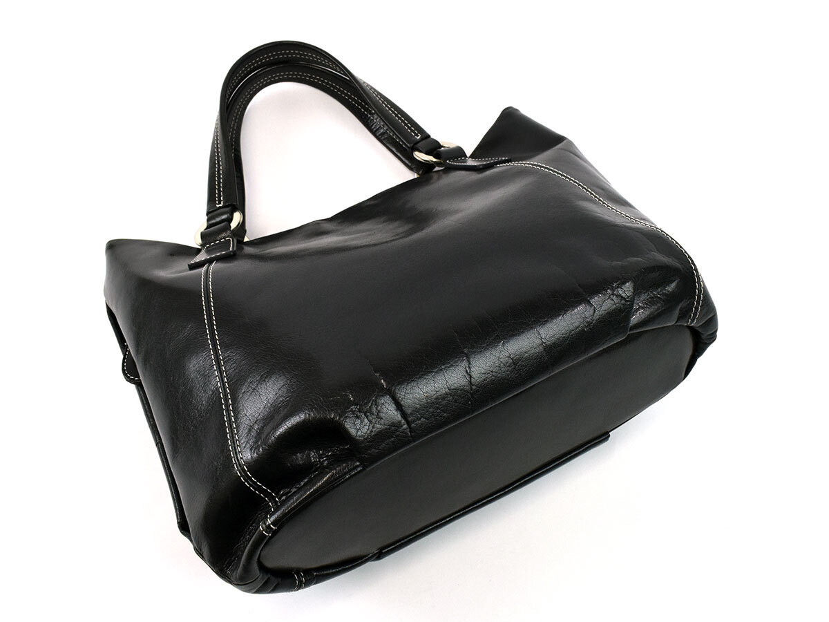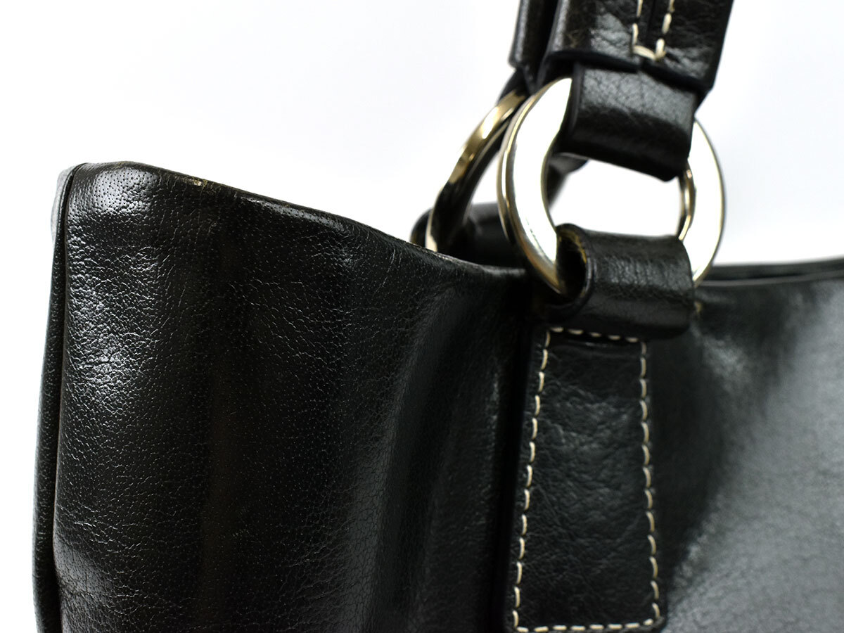 持ち手の根元部分に割れ・剥がれ、内側の広範囲に変色・シミ、金具に若干のスレがございます。 内側にやや使用感が窺えますが、ご使用には差し支えなくまだまだお使い頂ける商品です。 |