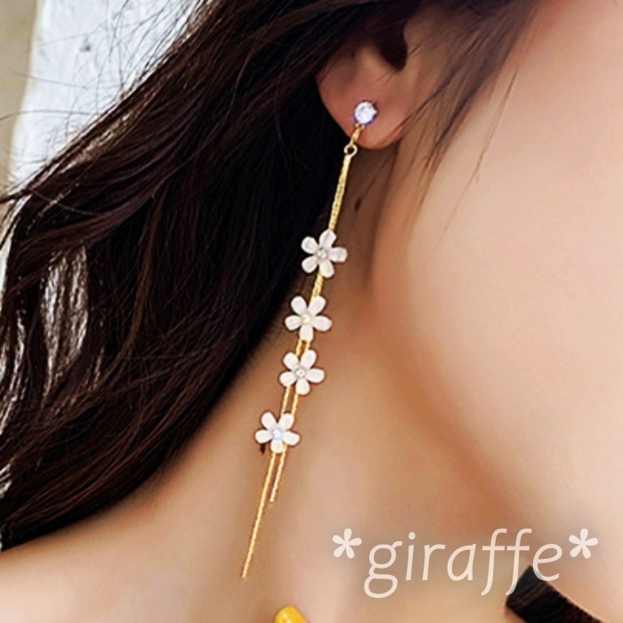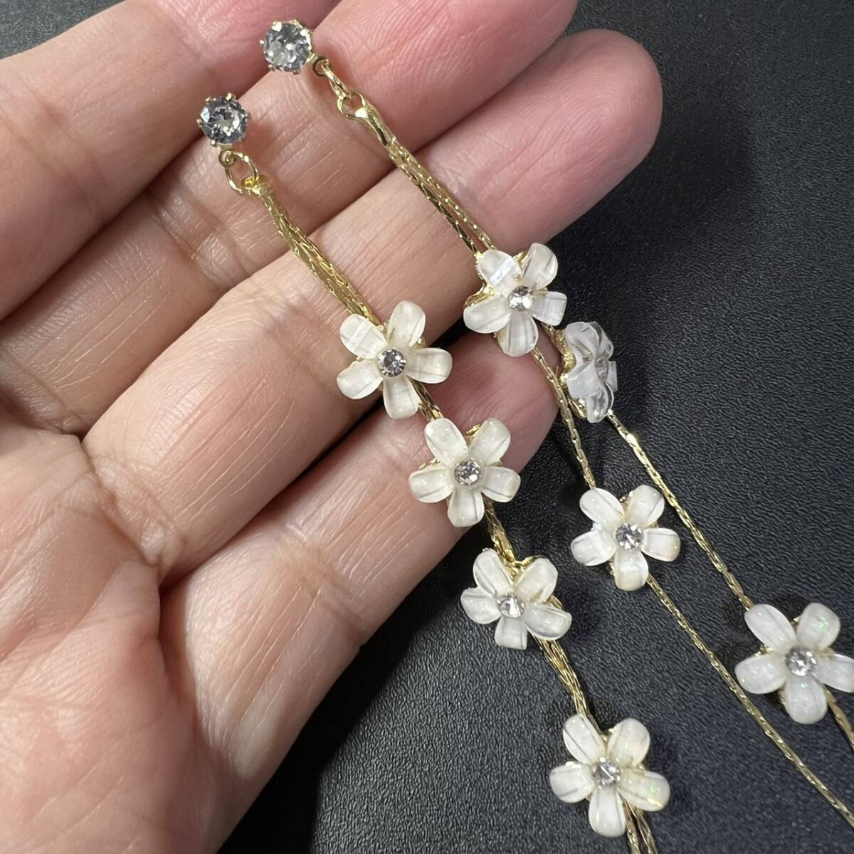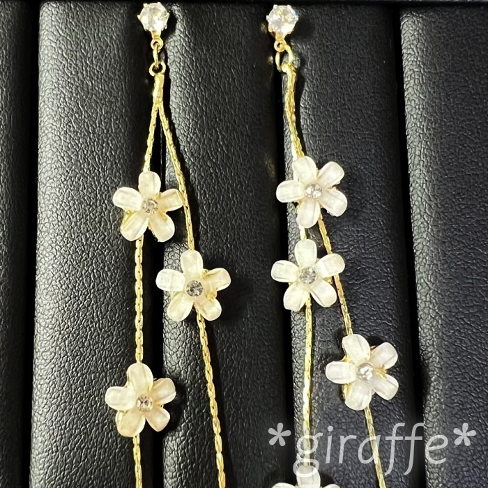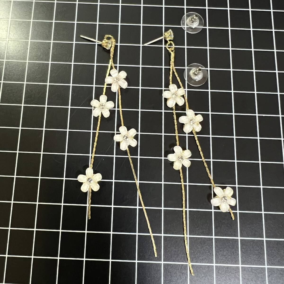 ゴールドカラーに白い花が映えるロングタイプのスタッドピアスです。
