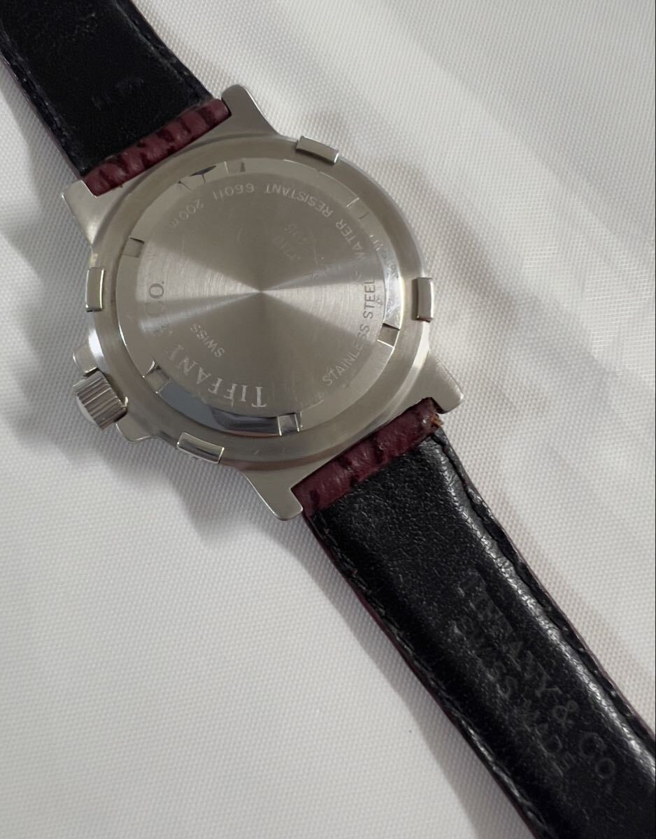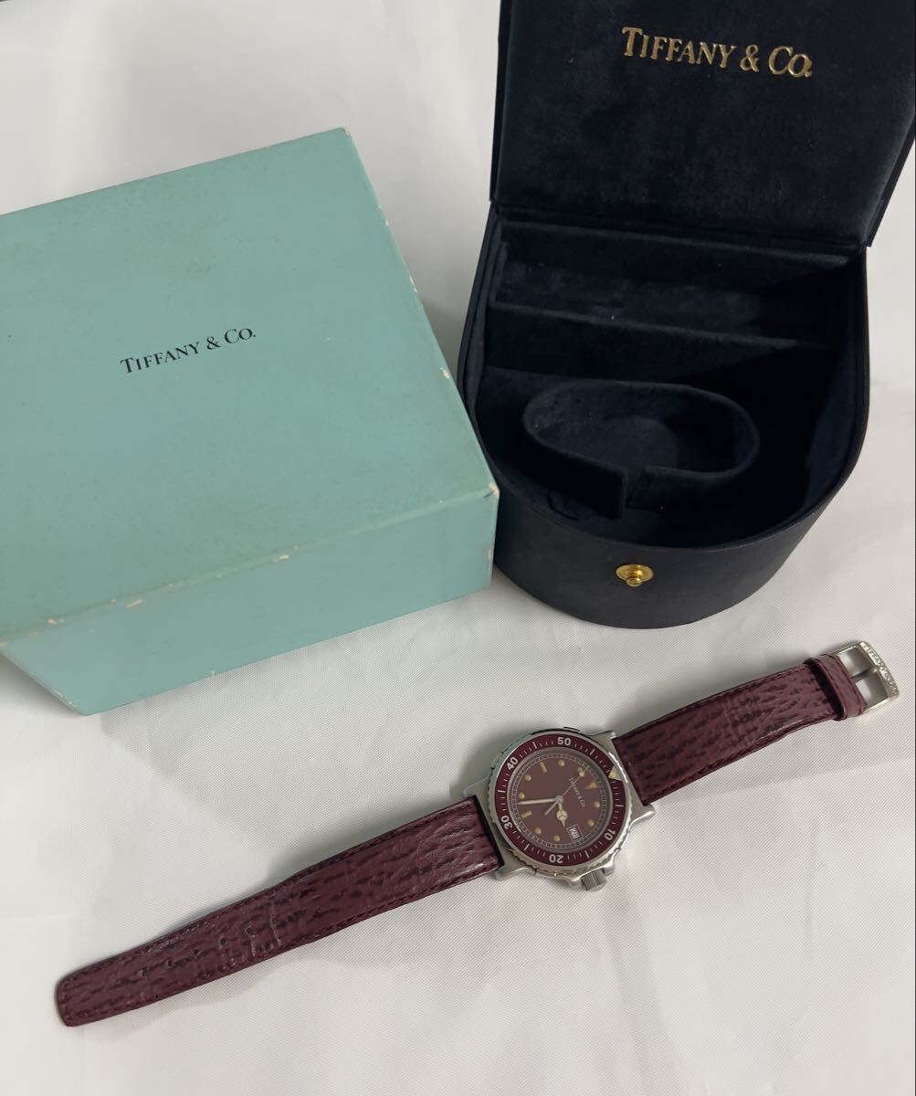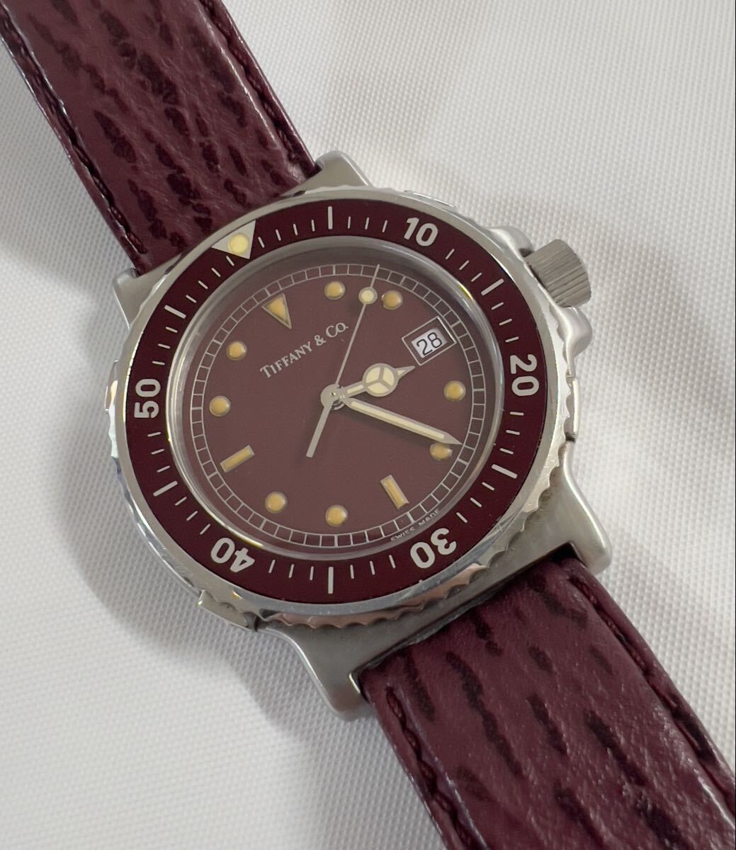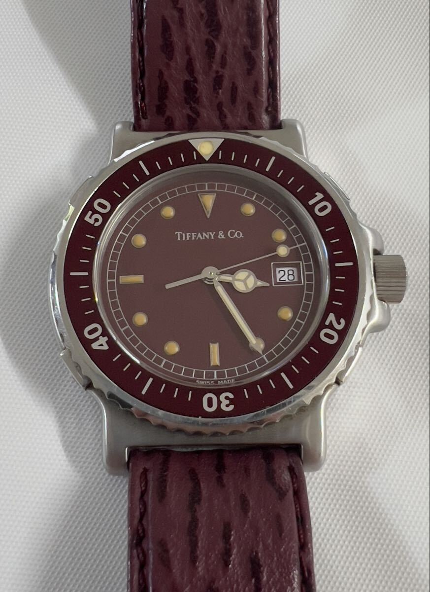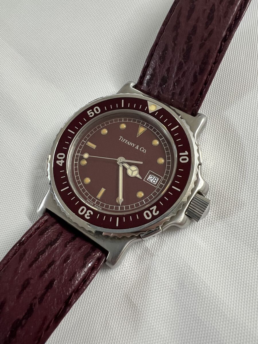 ラージサイズ 極美品 TIFFANY&Co. ティファニー M0710 メンズ ダイバー ワインレッド文字盤 トリチウム クォーツ 腕時計 純正ベルト 純正尾錠