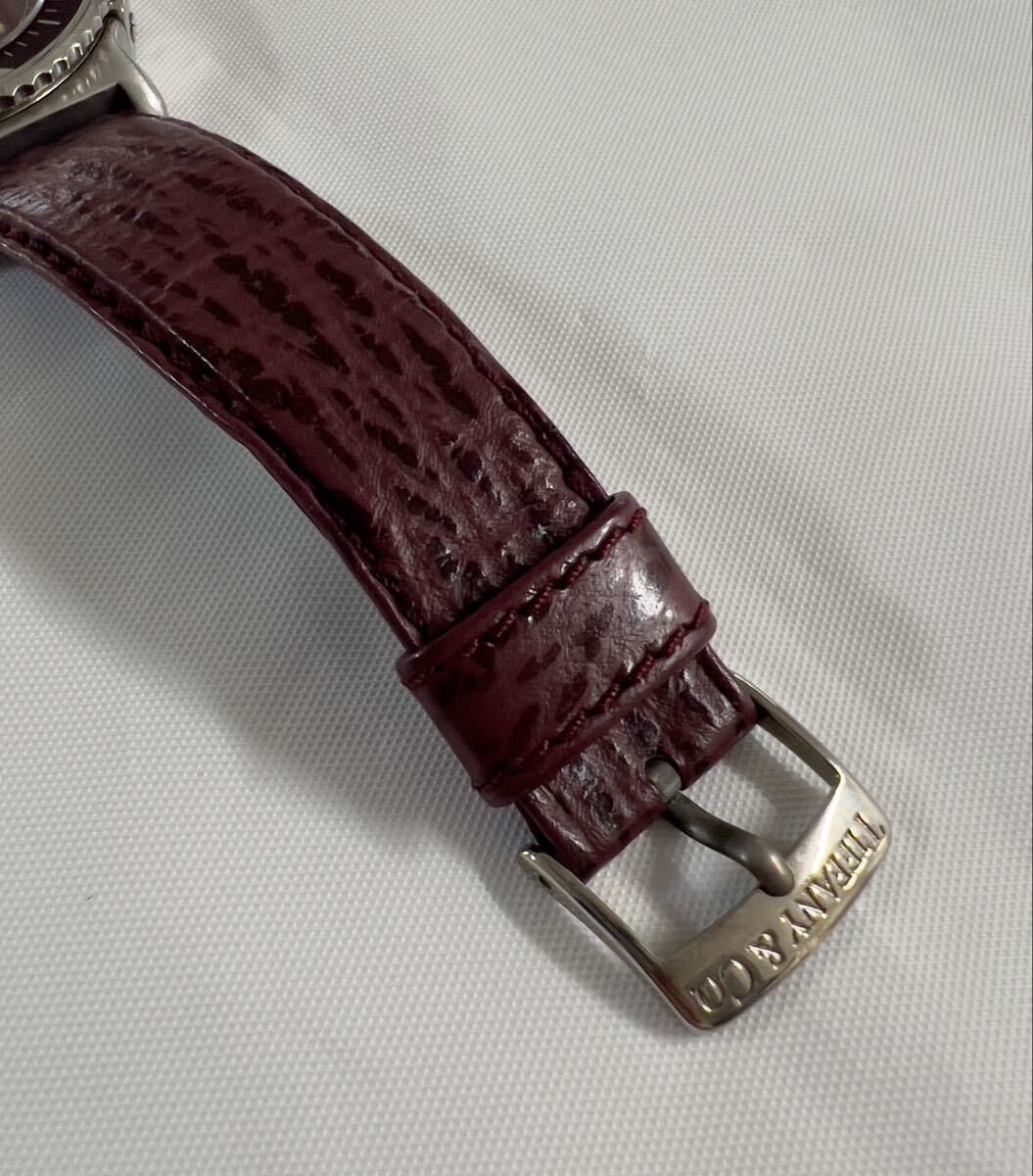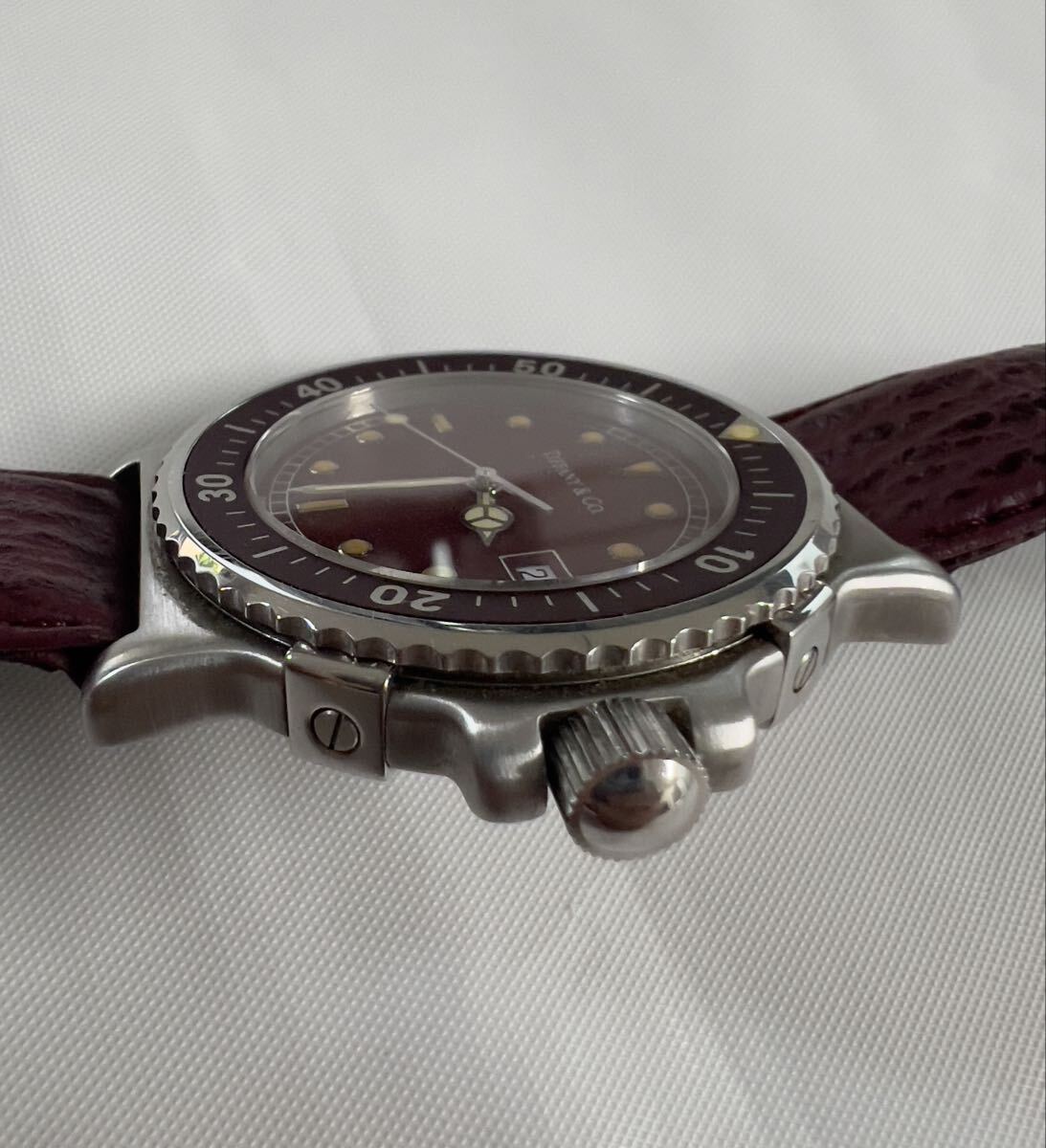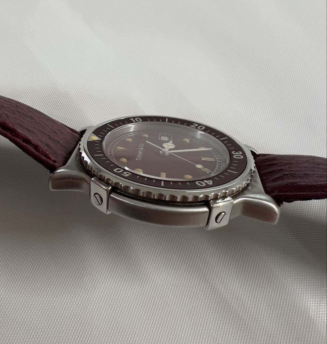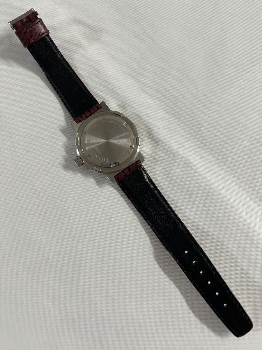 ラージサイズ 極美品 TIFFANY&Co. ティファニー M0710 メンズ ダイバー ワインレッド文字盤 トリチウム クォーツ 腕時計 純正ベルト 純正尾錠