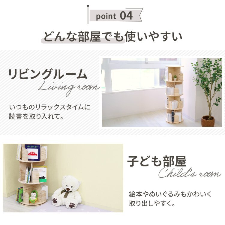 \4面収納で大容量/ 本やCDの収納にお困りの方におすすめな、木製の回転本棚です。 〇商品の特徴 ・360度回転ができ、どこからでも出し入れ可能 ・コンパクトだけど大容量に収納 ・お子さまも安心安全な角丸設計 シンプルなデザインだから、リビングや子供部屋、寝室など様々な場所で大活躍します。。 【商品仕様】 タイプ:5段 カラー:ナチュラル木目調 サイズ:(約)直径39cm×160cm 重量:(約)15.6kg 耐荷重:約10㎏ 素材:パイン材 |