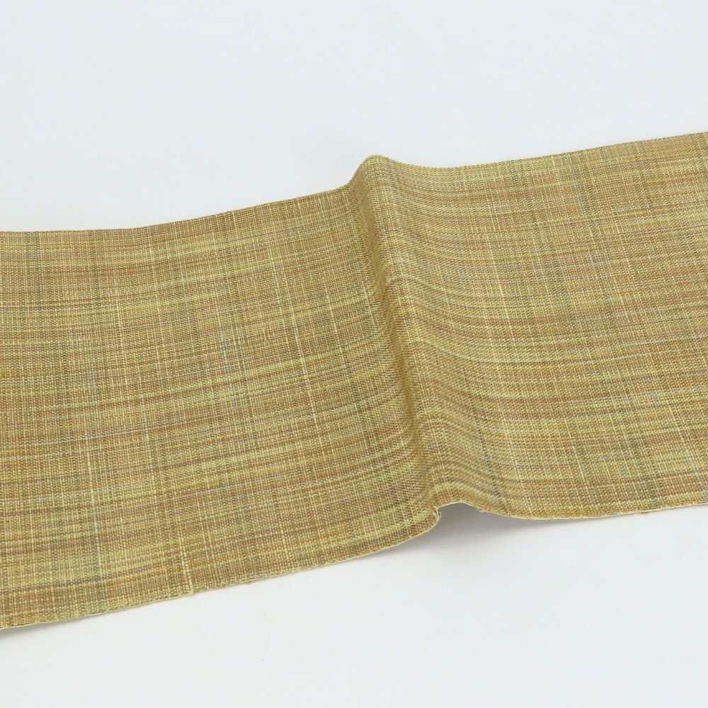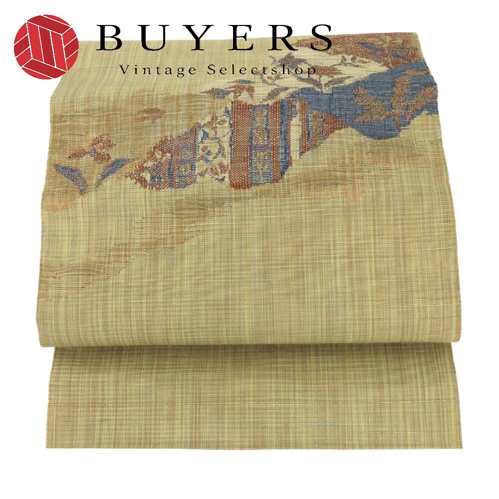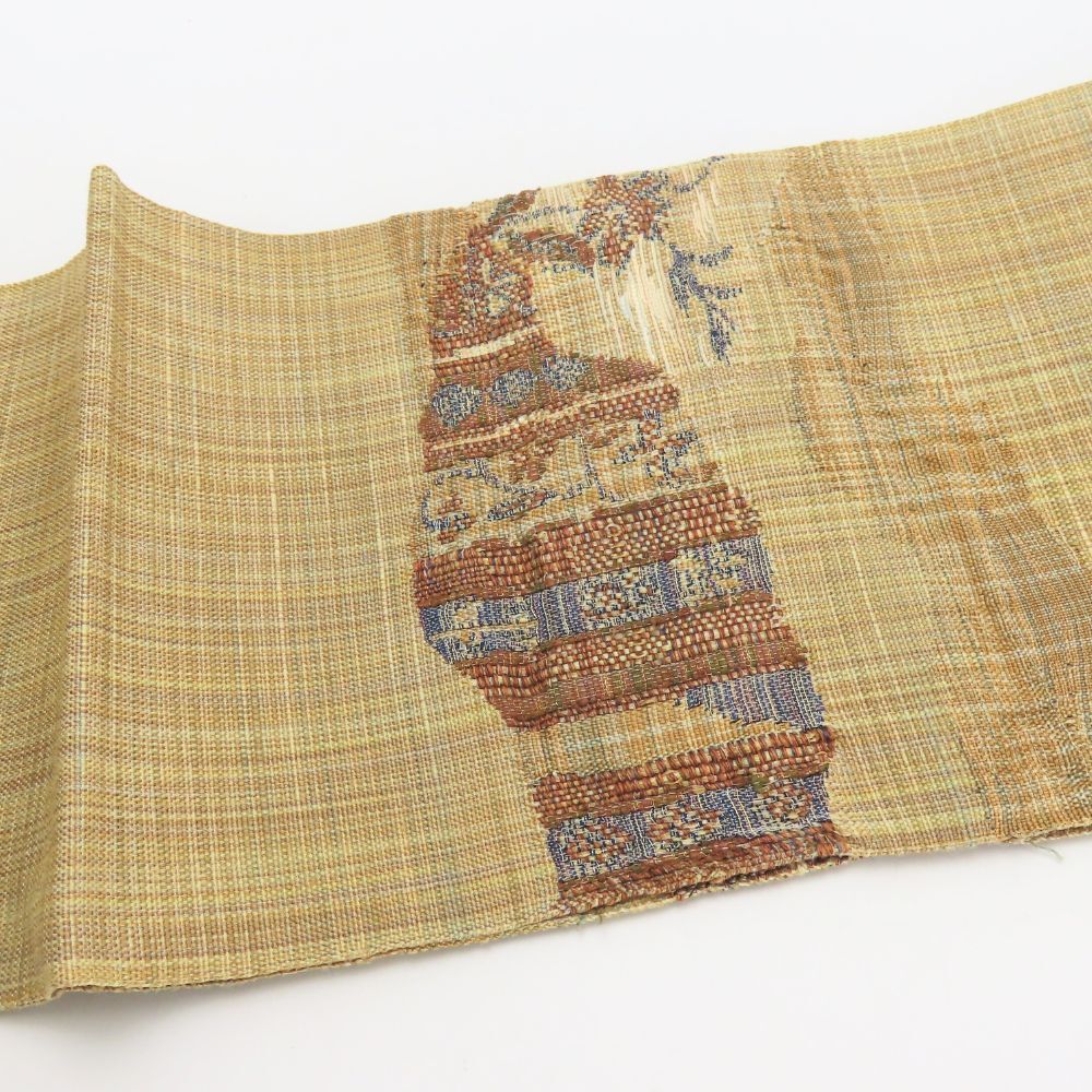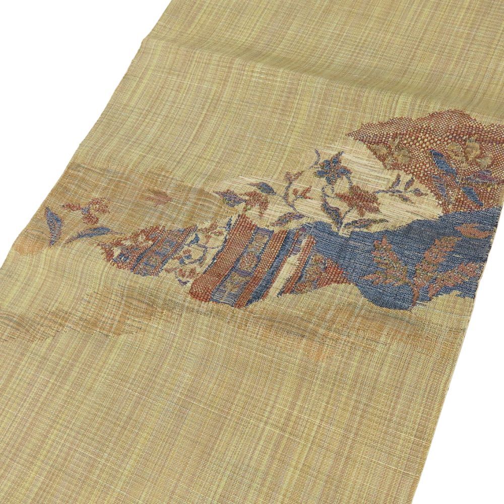 中古 名古屋帯 八寸 綿麻 ベージュ ブラウン系 ブルー 名古屋仕立て 洒落帯 モダン 和装 呉服 和服 きもの レディース 女性