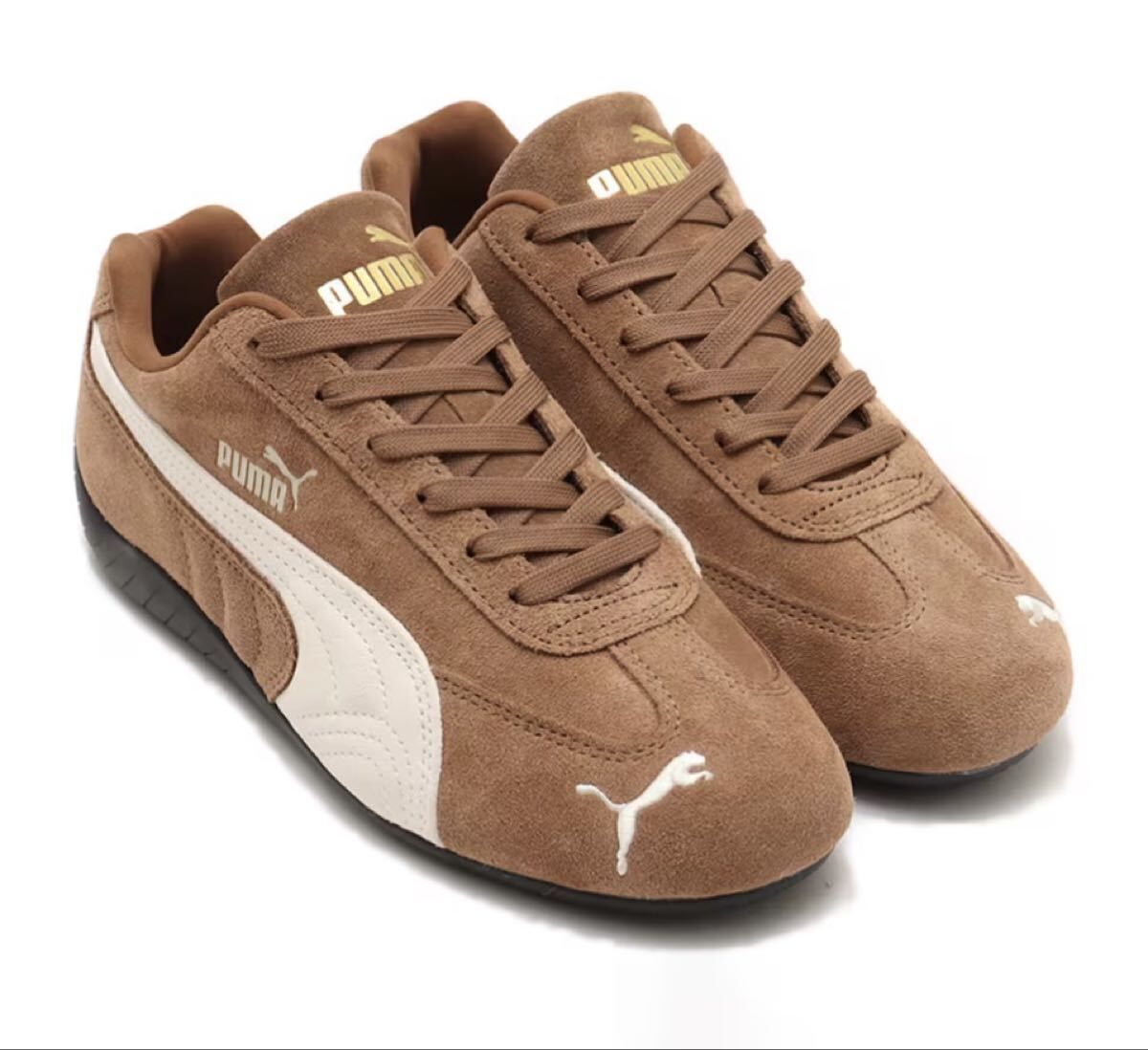 スピードキャットは、1999年に誕生し、80年代から90年代にかけてF1グランプリのドライバーが履いていた耐火レーシングシューズをベースにしたライフスタイルシューズです。レーシングにインスパイアされたなめらかなラインと空気力学に基づいたデザインにより、ファッションやスニーカーカルチャーに衝撃を与えてきました。今回、再びリリースされるスピードキャットOGは、スウェード素材をふんだんに使用した仕上がりとなっています。2000年代初頭のレーシングウェアに敬意を表し、つま先にはプーマキャット”の刺繍が施され、シュータンとフォームストリップの上にはゴールドのロゴがあしらわれています。