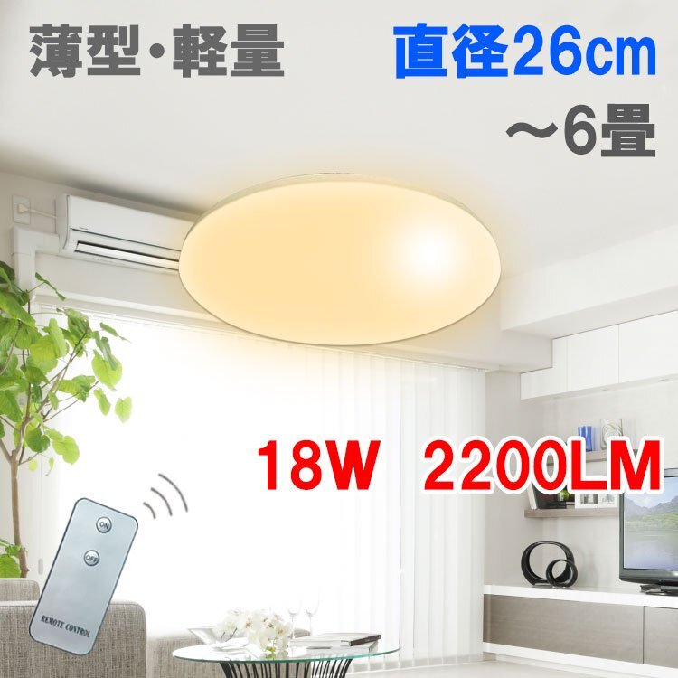 LEDシーリングライト 薄型 軽量 リモコン付き 6畳以下用 天井照明 リビング 引っ掛けシーリング ワンタッチ取り付け 電球色 D26-18W-Y-RMC