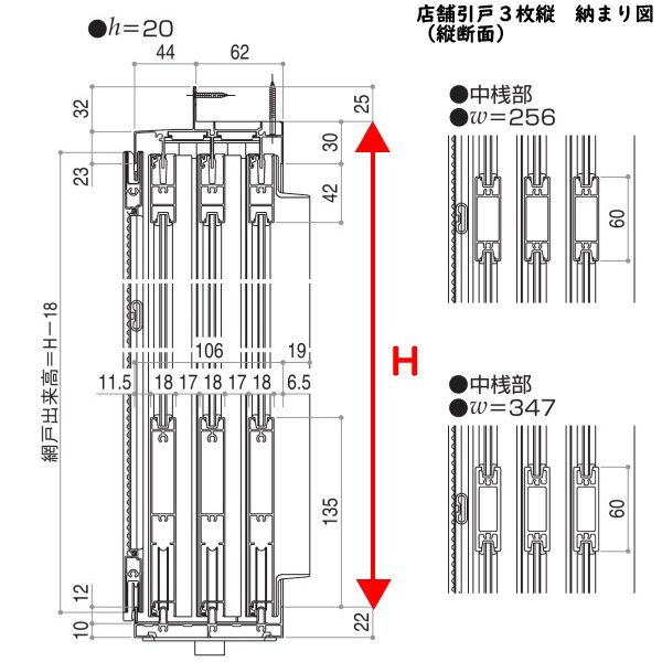 商品名 | アルミサッシ 店舗引戸 半外 9TH W2600×H2030 (25620-3) 3枚戸 |