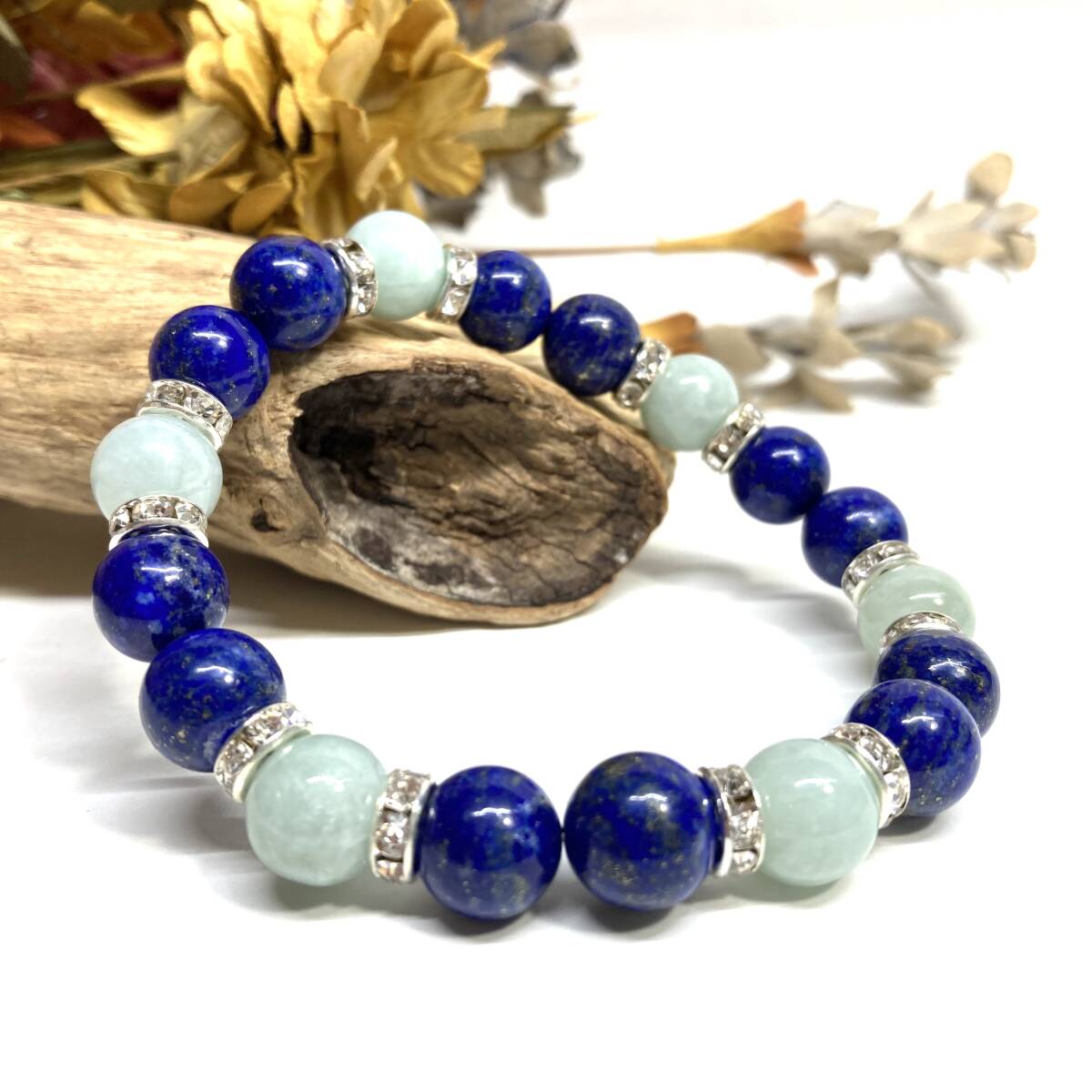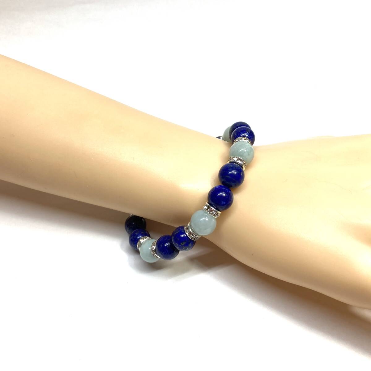 こちらは、ラピスラズリとビルマ翡翠を組み合わせたパワーストーンブレスレットです。間にはロンデルを挟み高級感あるデザインに仕上げております。石大きさは腕にも馴染みやすいように10mm玉で内径約18cm(伸可能)です。(サイズ変更の場合は取引ナビにてご連絡をお願いします。) 数に限りがございますので気になる方はお早めにどうぞ。
